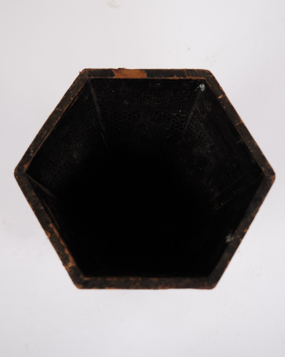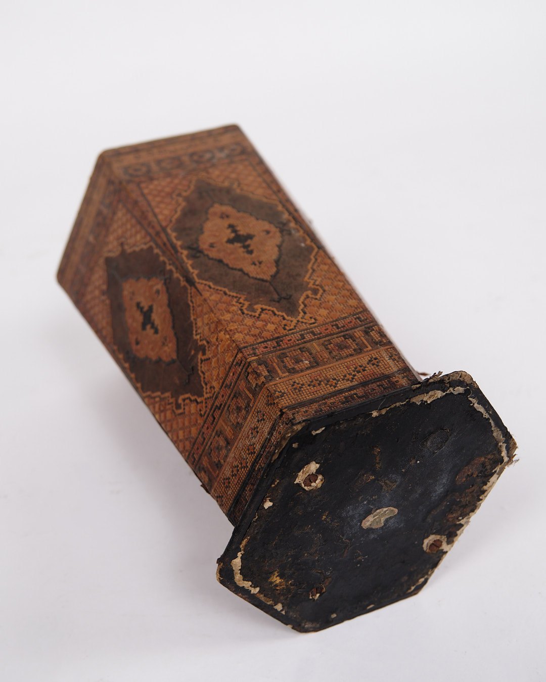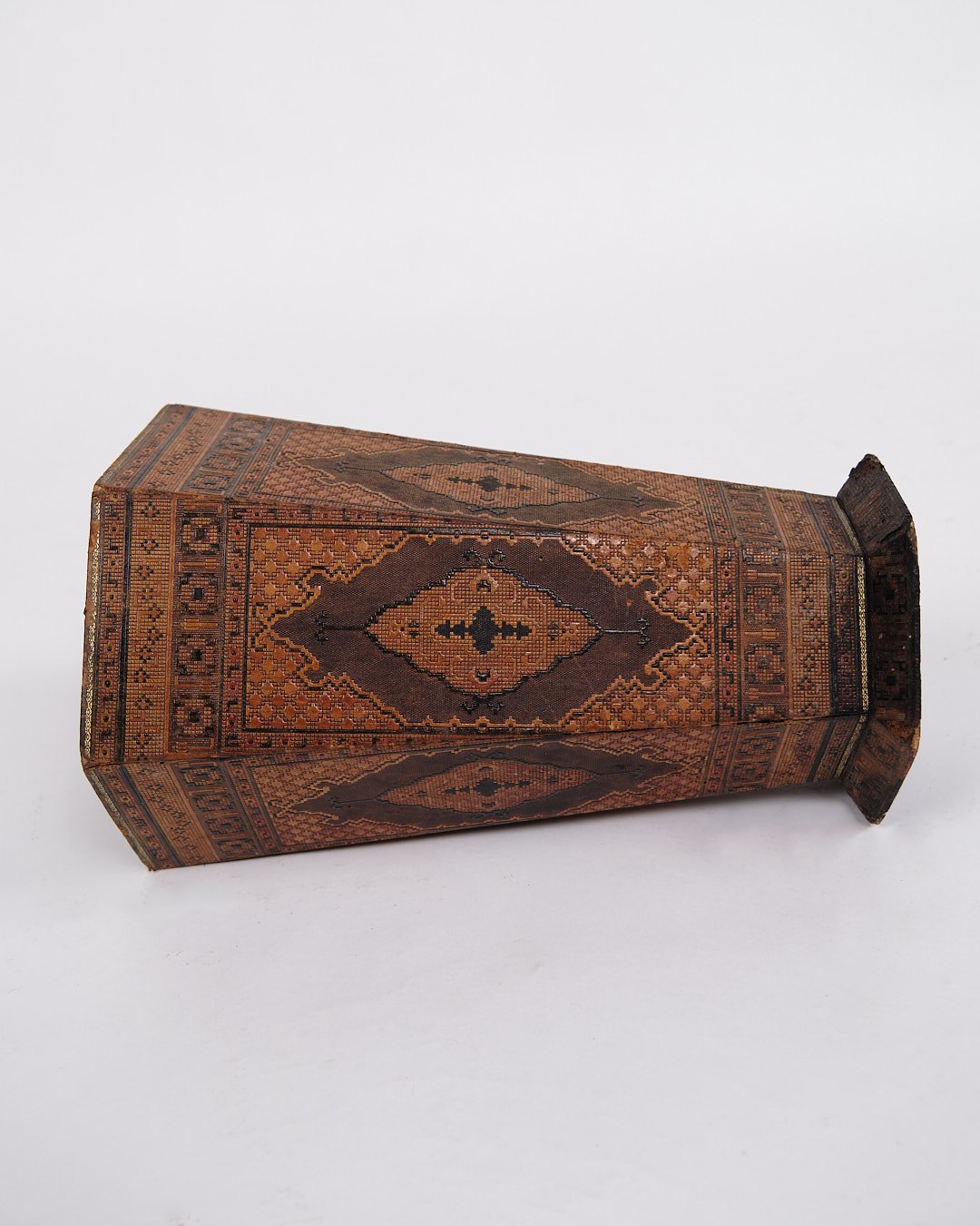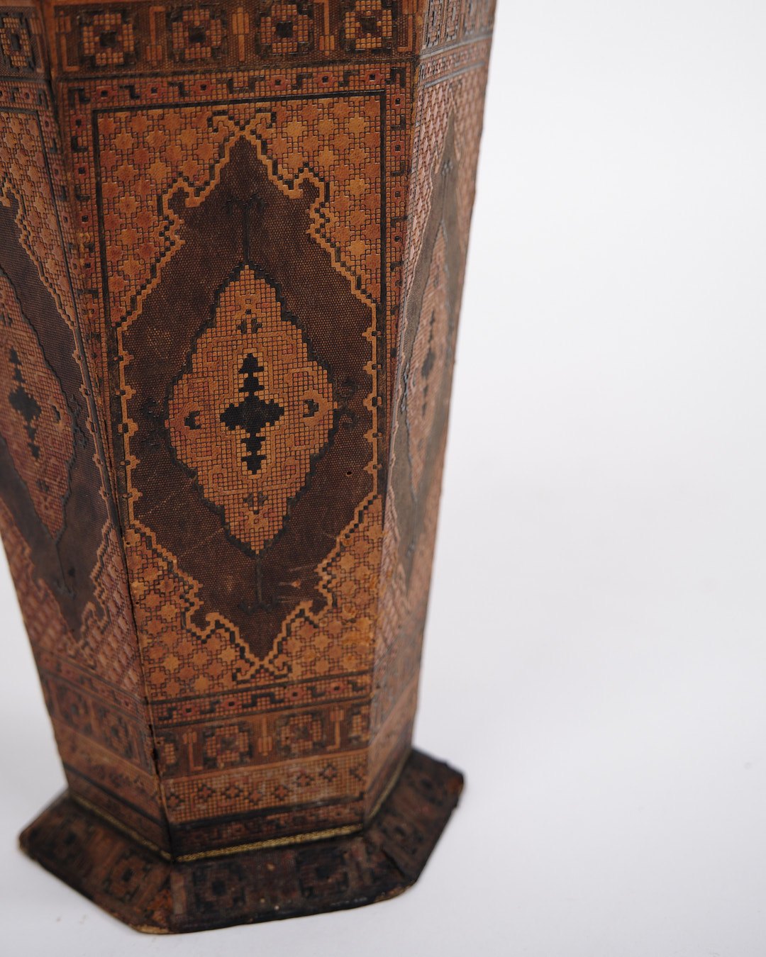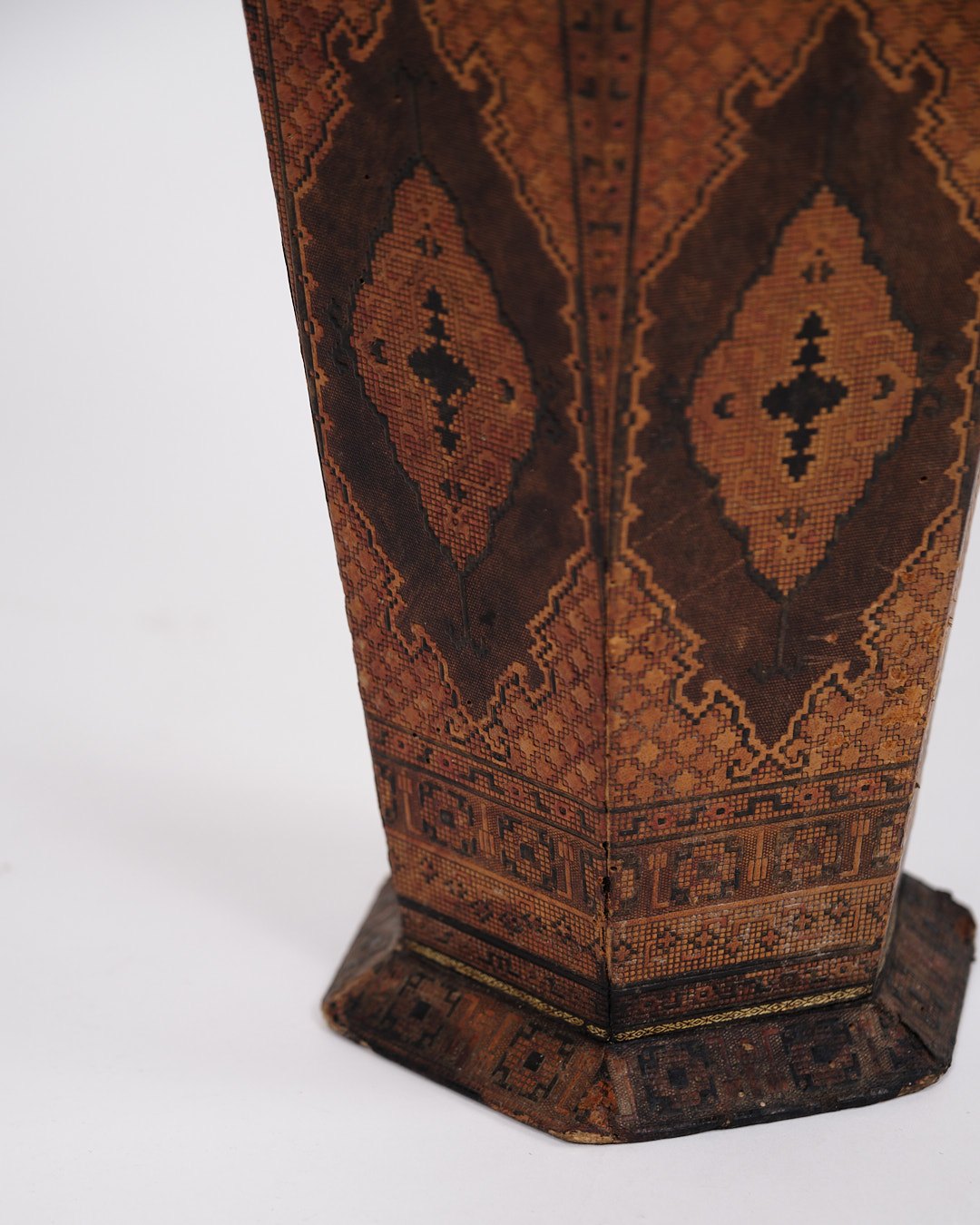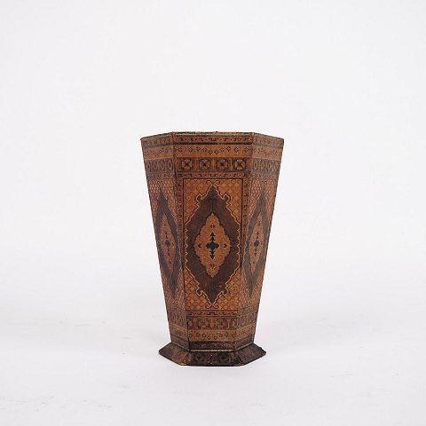 Text zugänglich auf Dänische: Dekorativ vase fra 1900-tallet, udført i mørkt træ med smukt orientalsk inspireret intarsia.