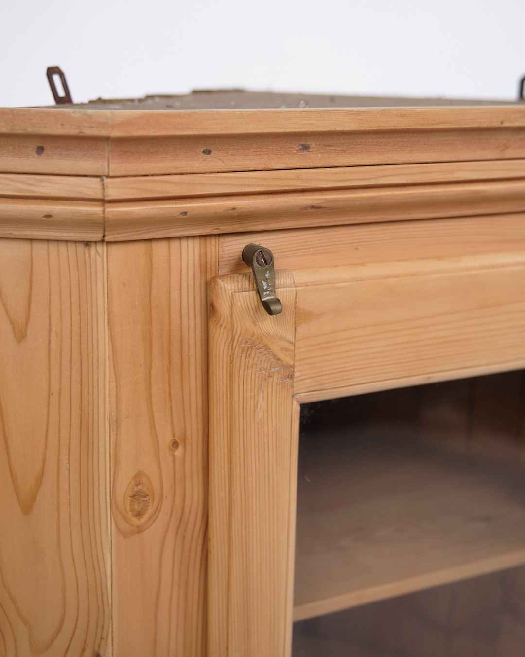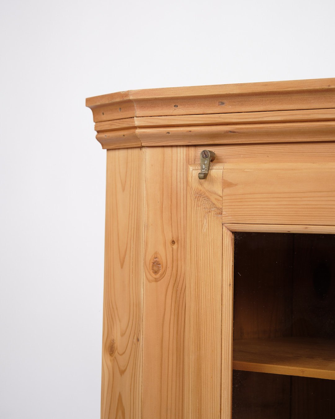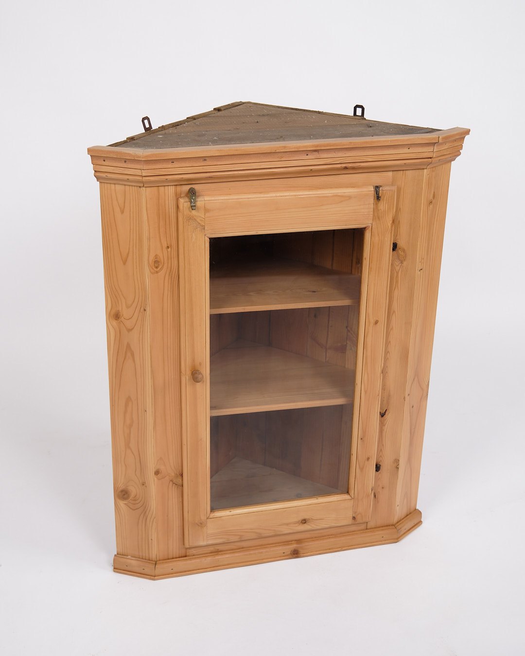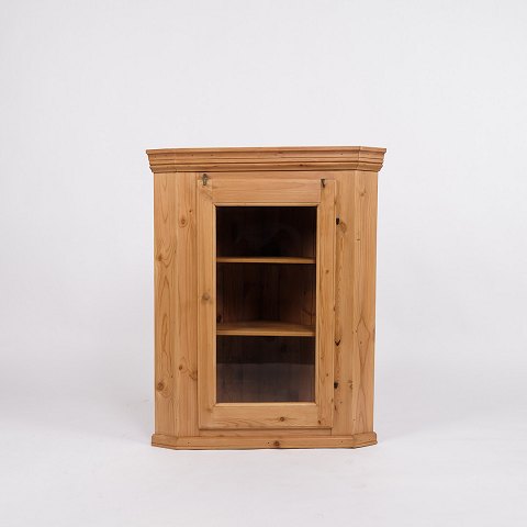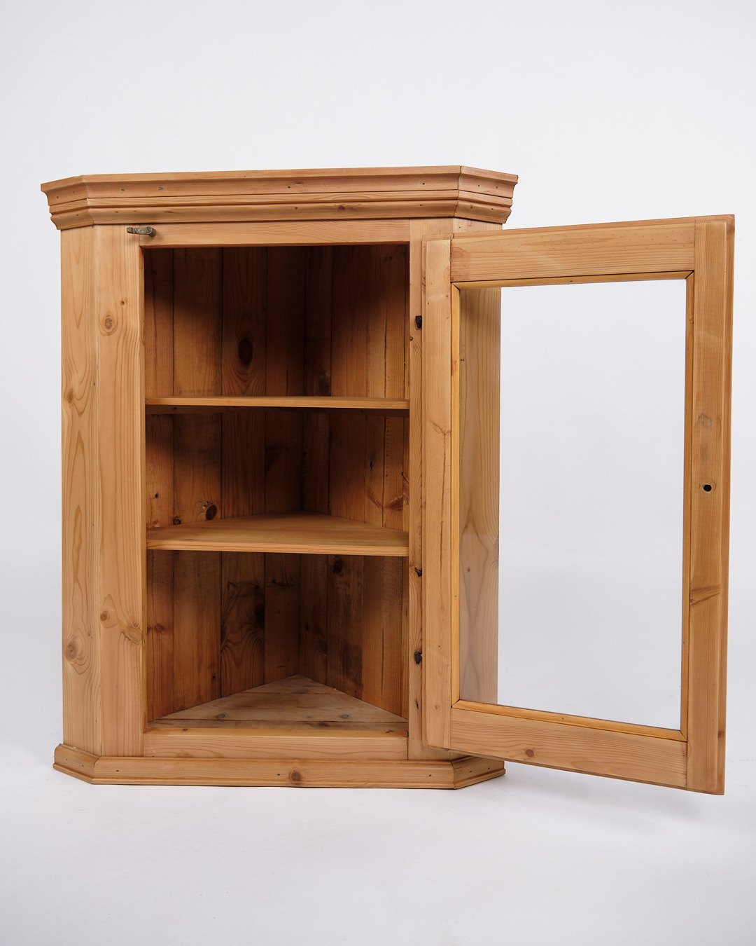 Text zugänglich auf Dänische: Antikt hænge hjørneskab i fyrretræ med glasdør. Fra 1890’erne.