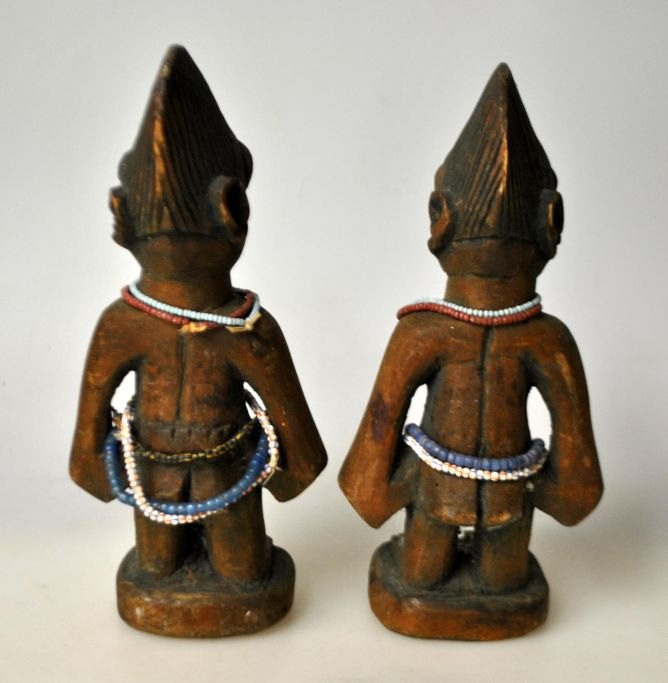 Pair of wooden figures, man and woman, 20th century. Nigeria. Vestafrika. With pearl necklaces around the waist and neck. H.: 18 cm.