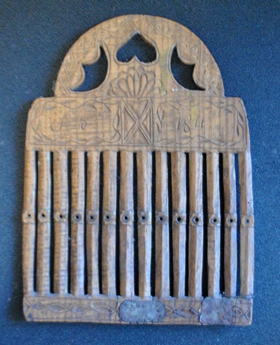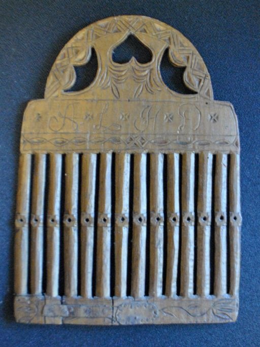 Antiker dänischer Webstühle aus lackierter Buche, 1811. Auf einer Seite teilweise bronziert. Mit geschnitztem Herz und den Inschriften: ALHD 26 x 19 cm.