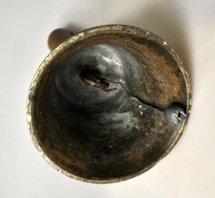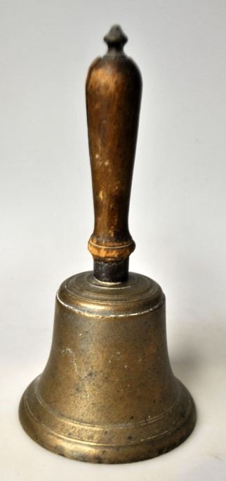 Antik 1700-tals barok bord klokke af malm. Med skæft af drejet træ. H.: 22 cm.