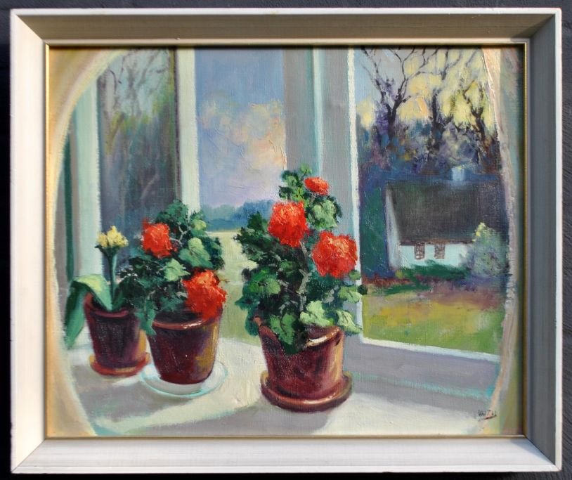 Pihl, Kaj (1894 - 1978) Denmark: Potted plants in a window. Oil on canvas. Signed. 42 x 52 cm.