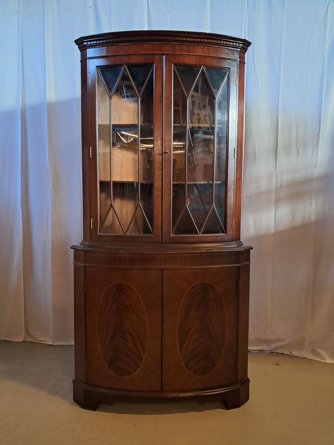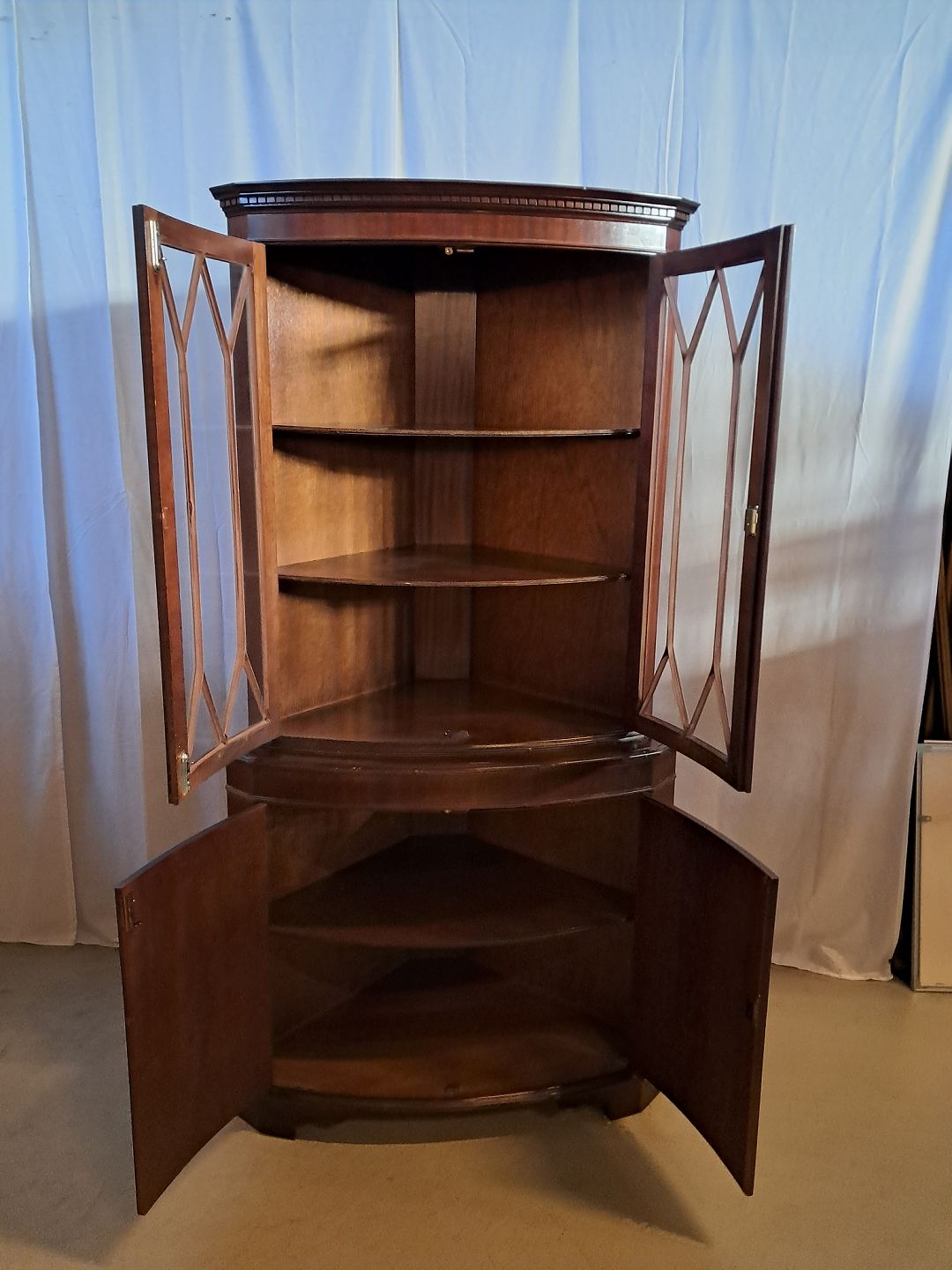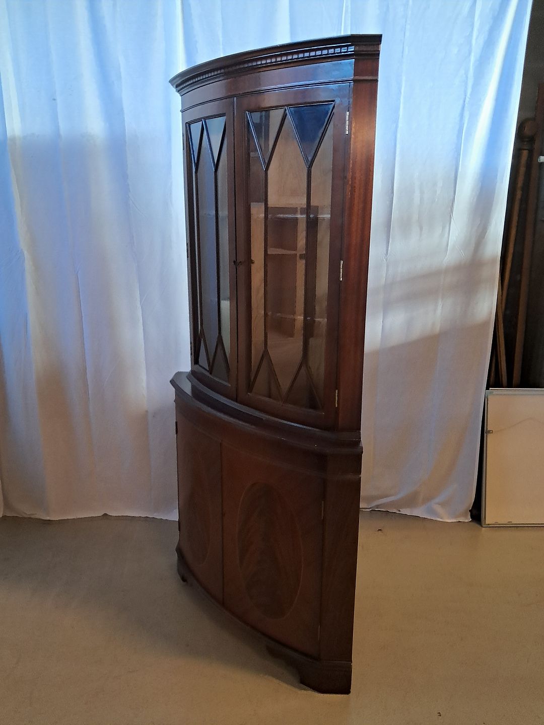 Hjørneskab i fineret mahogni, fra 1980erne.