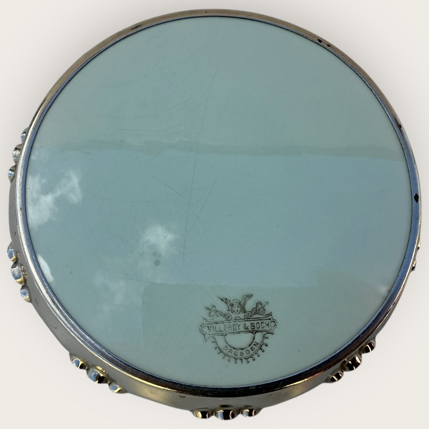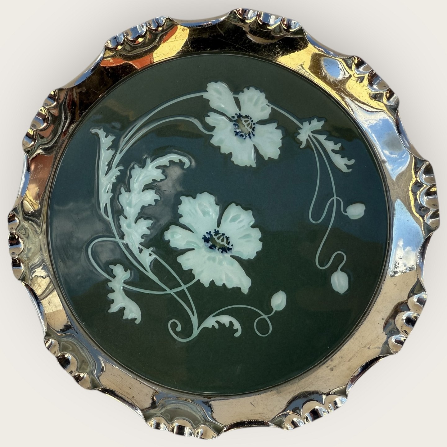 Villeroy & Boch, Flaskebakke / fad, diameter 17cm, Jugendstil / Art Nouveau i porcelæn og med sølvplet kant, lidt krakeleringer under glasuren (se foto) ellers pæn stand