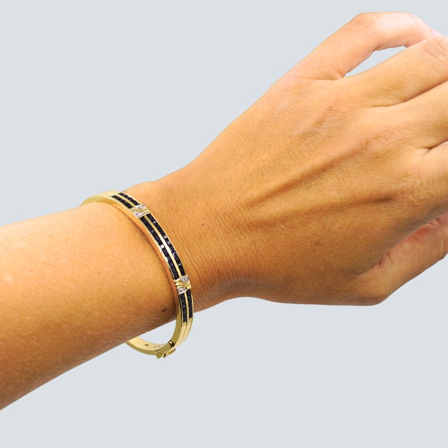 Armring af 18 kt. guld, prydet med en safirer og diamanter. Armringen kan åbnes. Med kasselås, samt dekorativ sikkerhedslås.