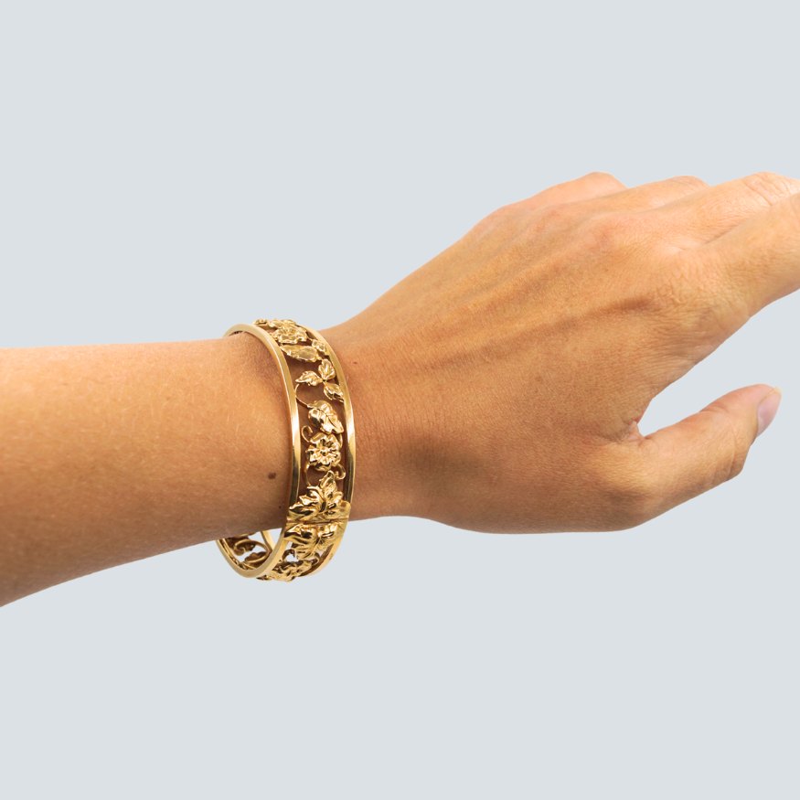Armring af 18 kt. guld, med blomster og bladmotiv. Armringen kan åbnes. Med kasselås, samt to sikkerhedslås. Lavet i Stockholm 1947.