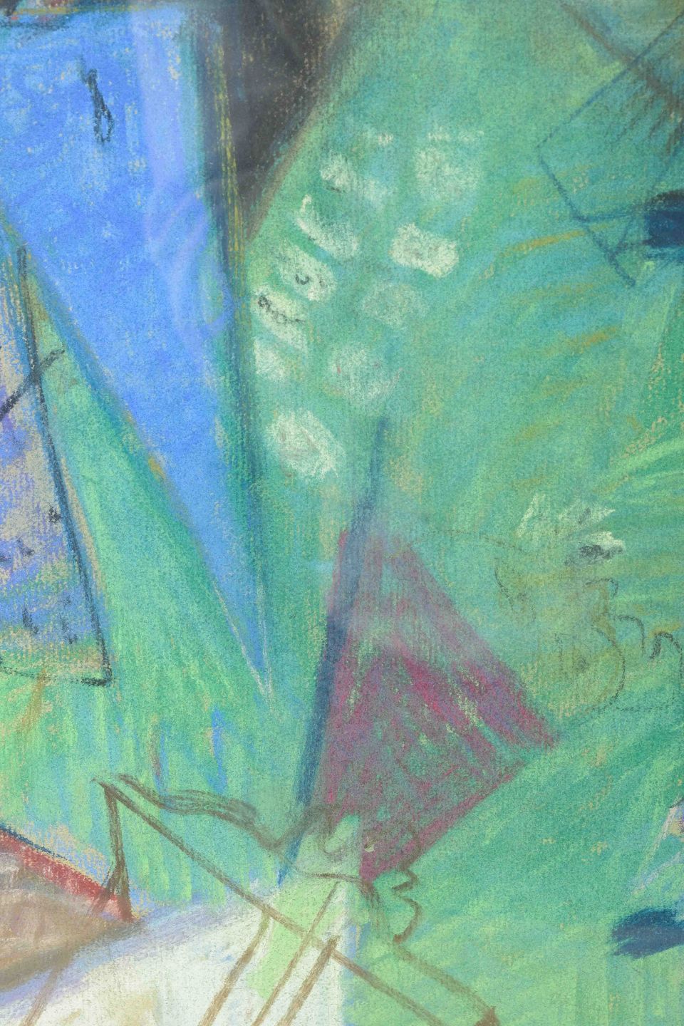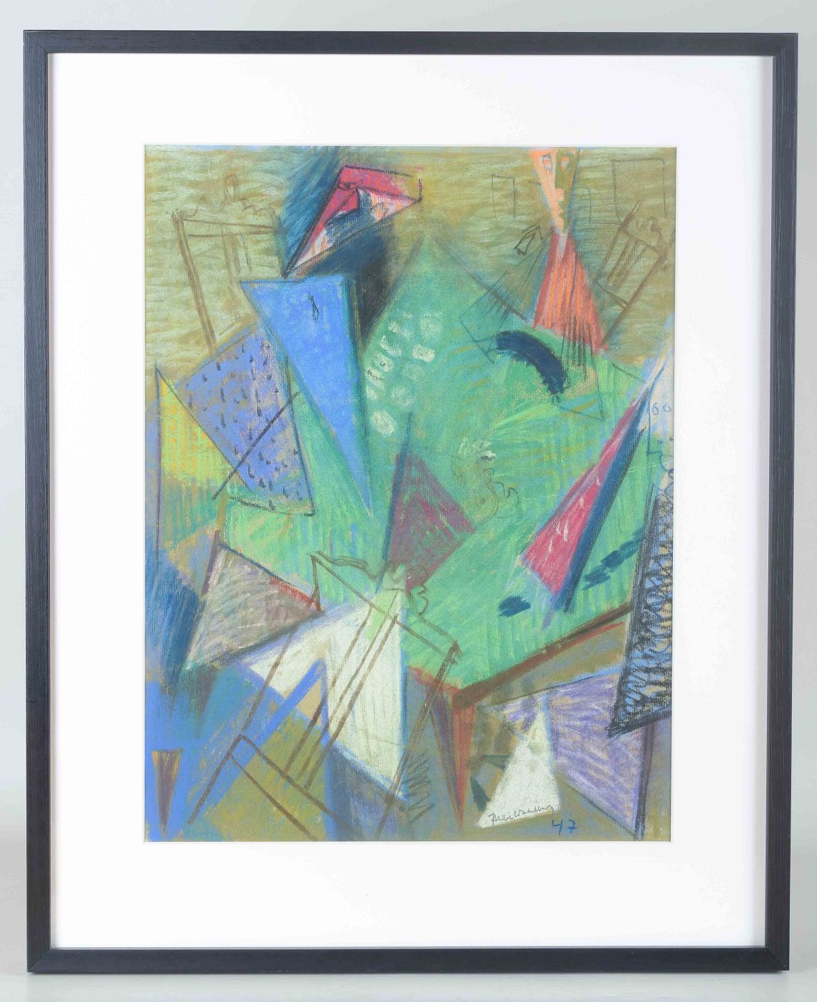 Et ekspressivt, geometrisk-abstrakt værk med et komplekst spil af trekantede og diagonale former, der overlapper hinanden i et rytmisk mønster. Farveflader i blå, grønne, røde og gyldne nuancer danner en vibrerende komposition med tydelige spor af Wahlbergs eksperimenterende tilgang til farve og form.