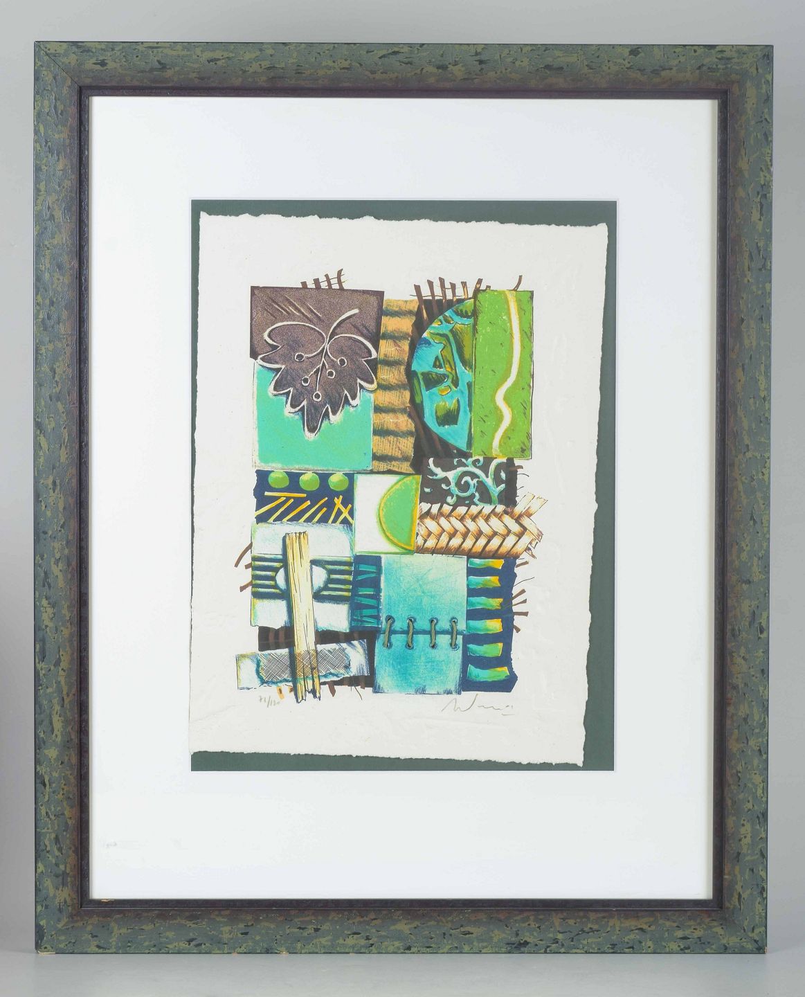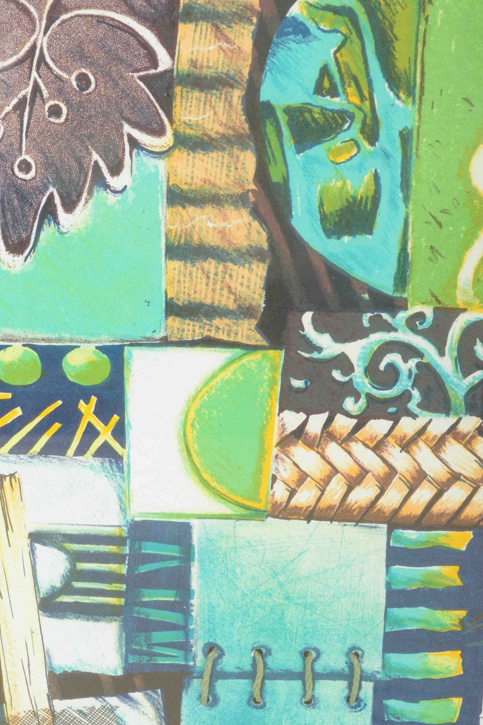 A colorful and dynamic lithograph where geometric and organic forms are combined in a patchwork-like composition. Shades of blue, green, and earthy tones create a rhythmic and textural whole, where elements such as leaves, woven structures, and decorative lines are interlaced. The work reflects Soucasse’s interest in balancing nature-inspired symbols with a more constructive, abstract visual language.