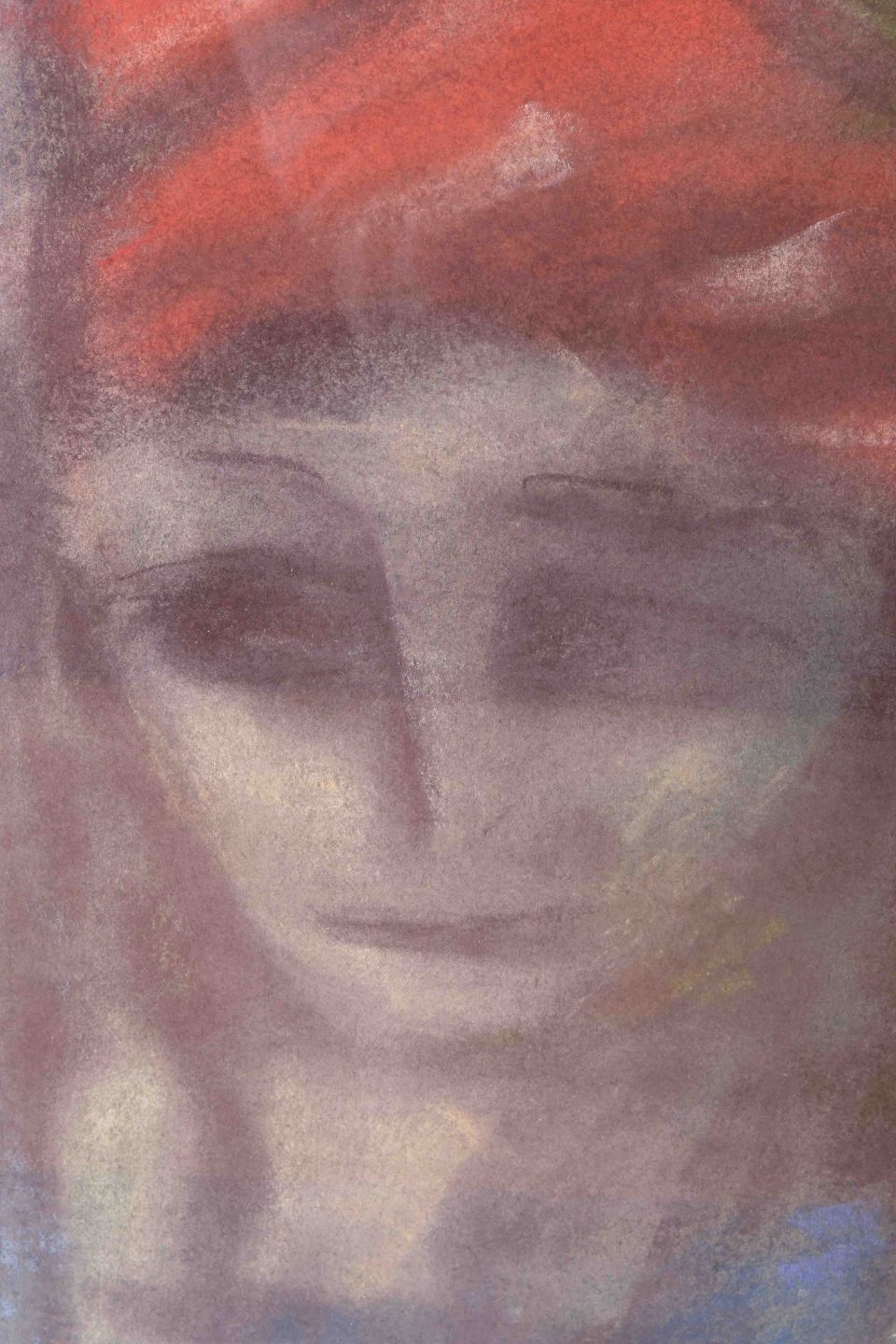 A sensitive and dreamlike portrait in subdued tones, where the soft lines and slightly blurred face lend the image a meditative and almost timeless character. The red headdress provides a warm contrast to the cooler violet and green shades in the background. Jordell’s use of crayon emphasizes the delicate and textural quality that gives the work a particular poetry.