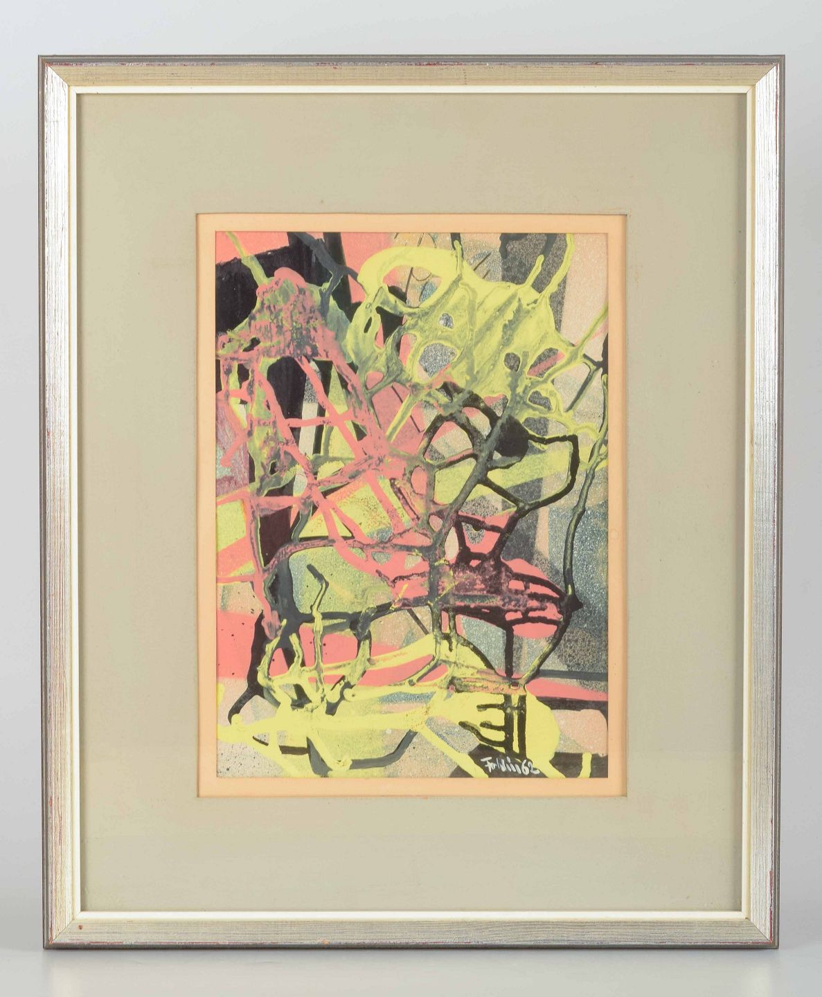 Et dynamisk abstrakt værk udført i gouache, hvor lag af organiske linjer og transparente farver væves sammen til en ekspressiv helhed. Værket demonstrerer Föhlíns karakteristiske sans for rytme, bevægelse og farvespil, som knytter ham til den nordiske modernismes formsprog