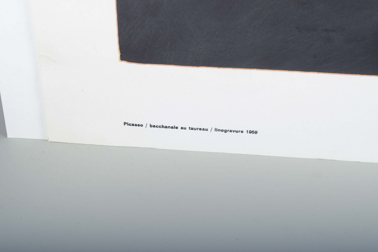 A vibrant and expressive work by Pablo Picasso, executed as a Linoleum cut in 1960, depicting a bacchanalian scene with figures and a bull in a stylized, almost archaic form.