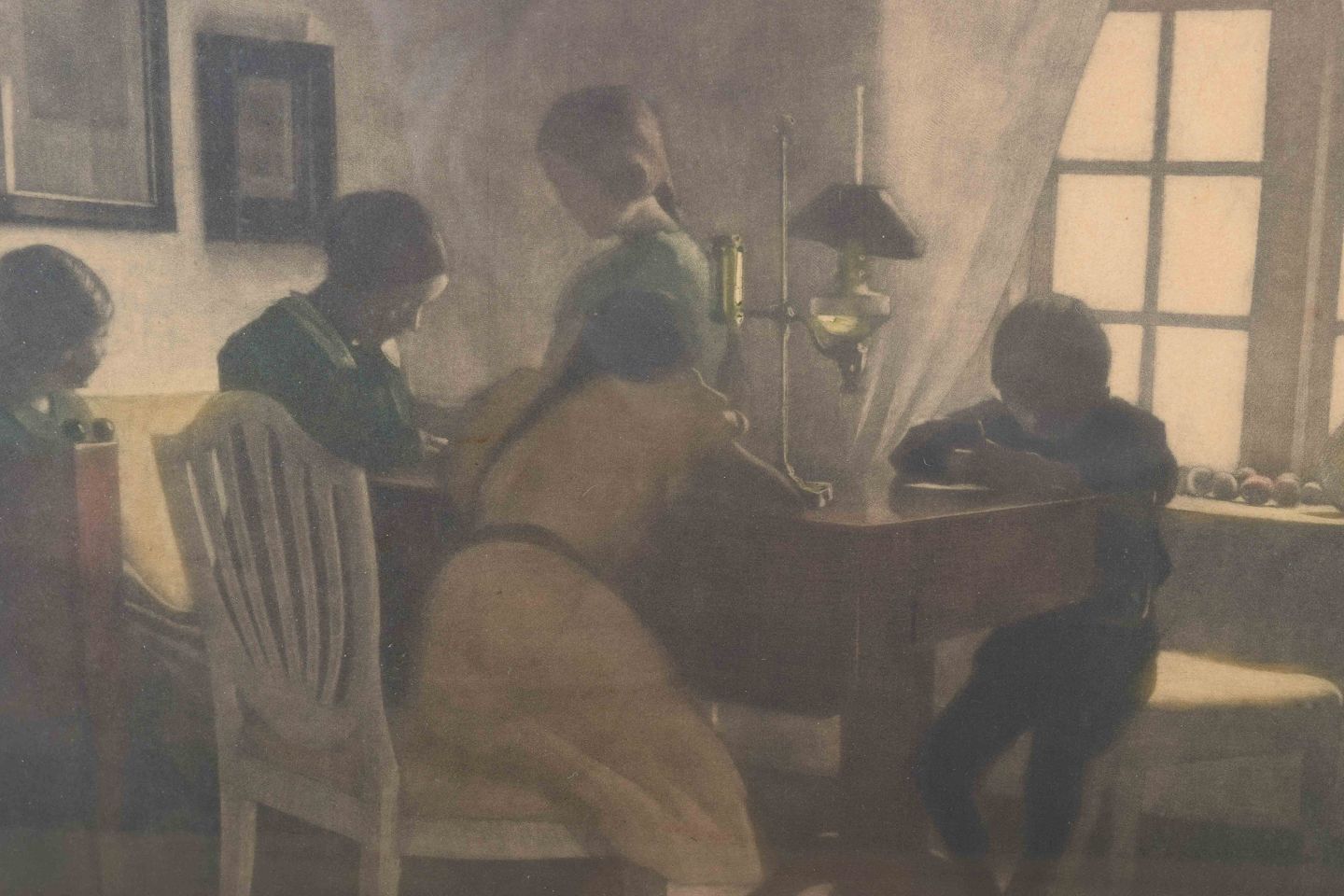 Et stemningsfuldt interiørmotiv af Peter Ilsted, hvor en gruppe personer er samlet omkring et bord i et dæmpet, nordisk lysindfald. Kompositionen fremhæver Ilsteds karakteristiske brug af ro, enkelhed og lys, som skaber en intim og næsten tidløs atmosfære. Værket kan dateres til ca. 1910–1925, Ilsteds modne periode, hvor han forfinede sin koloristiske mezzotint-teknik.