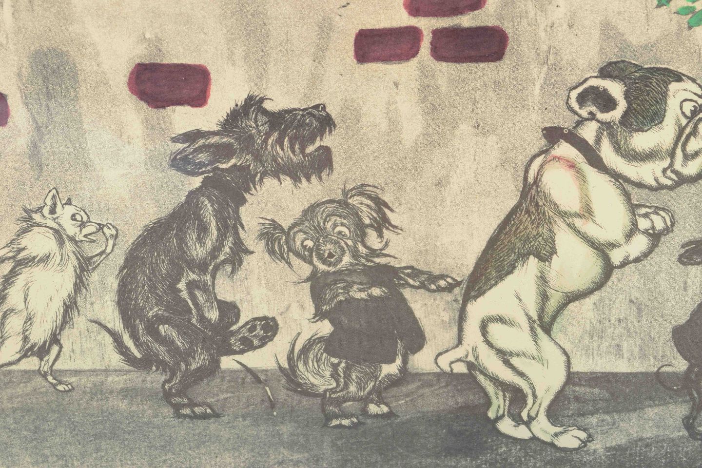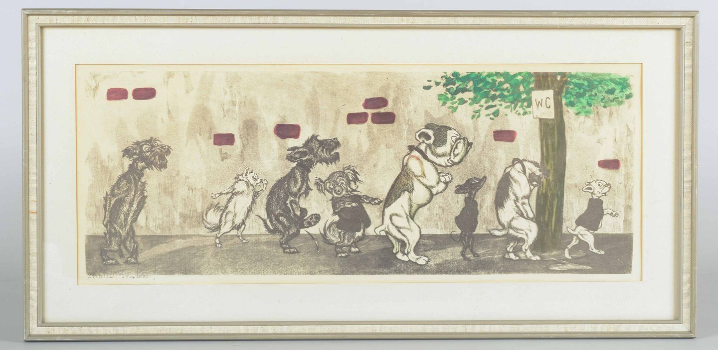 A humorous work by the French artist Boris O’ Klein, known for his satirical scenes of dogs in human-like situations. This piece depicts a line of dogs waiting in front of a WC, executed with caricatured expression and light hand-colouring.