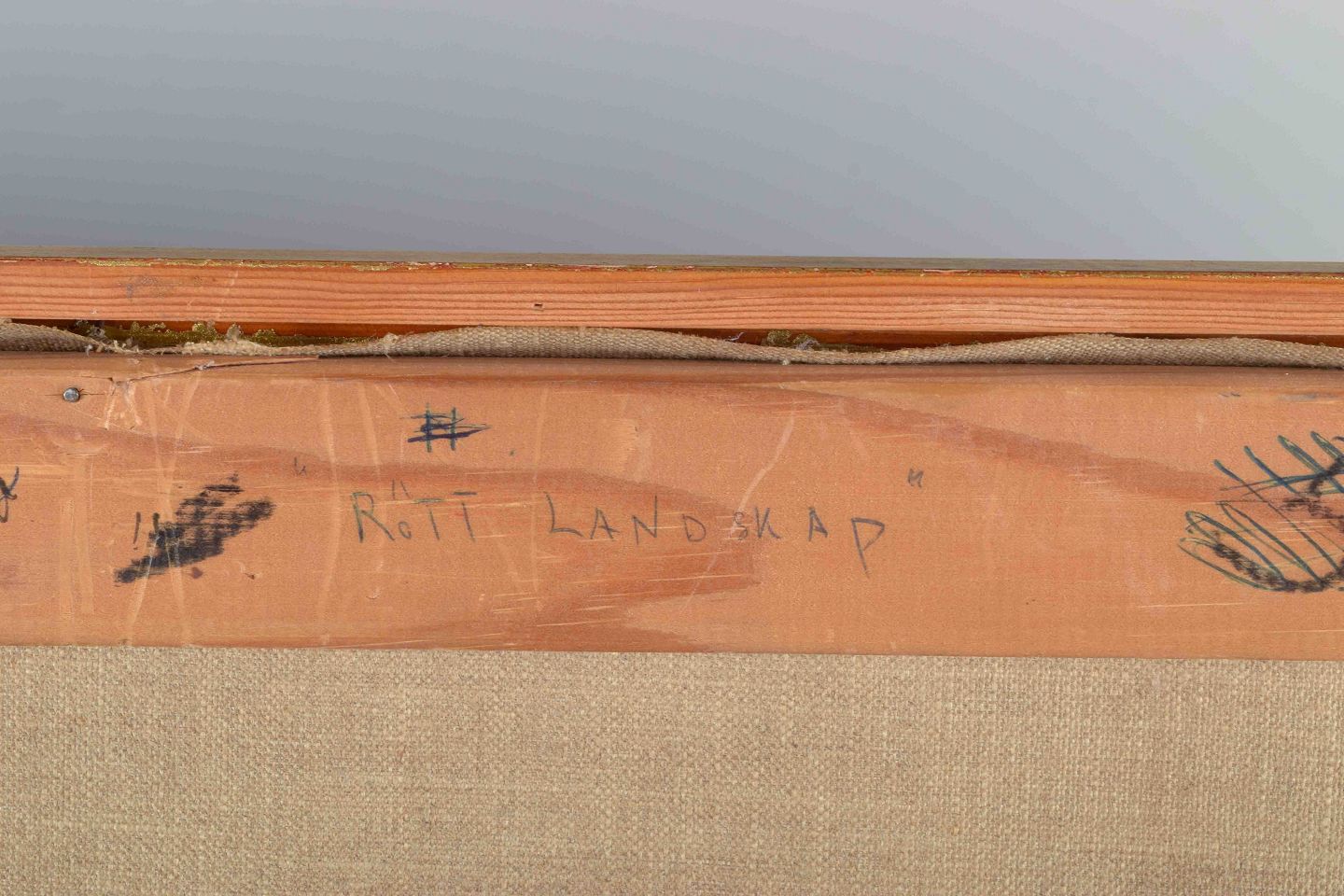 An expressive landscape painting by the Swedish artist Sven Erik Markhed. The work is characterized by broad, impasto brushstrokes in earthy red and brown hues, interrupted by areas of green and a blue horizon. A typical example of Markhed’s abstract interpretation of nature from the 1970s–1980s.
