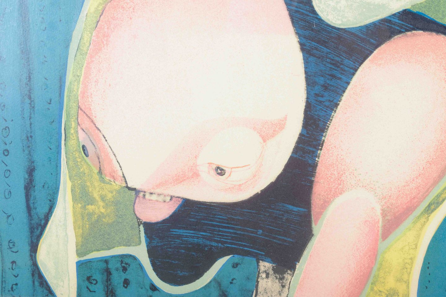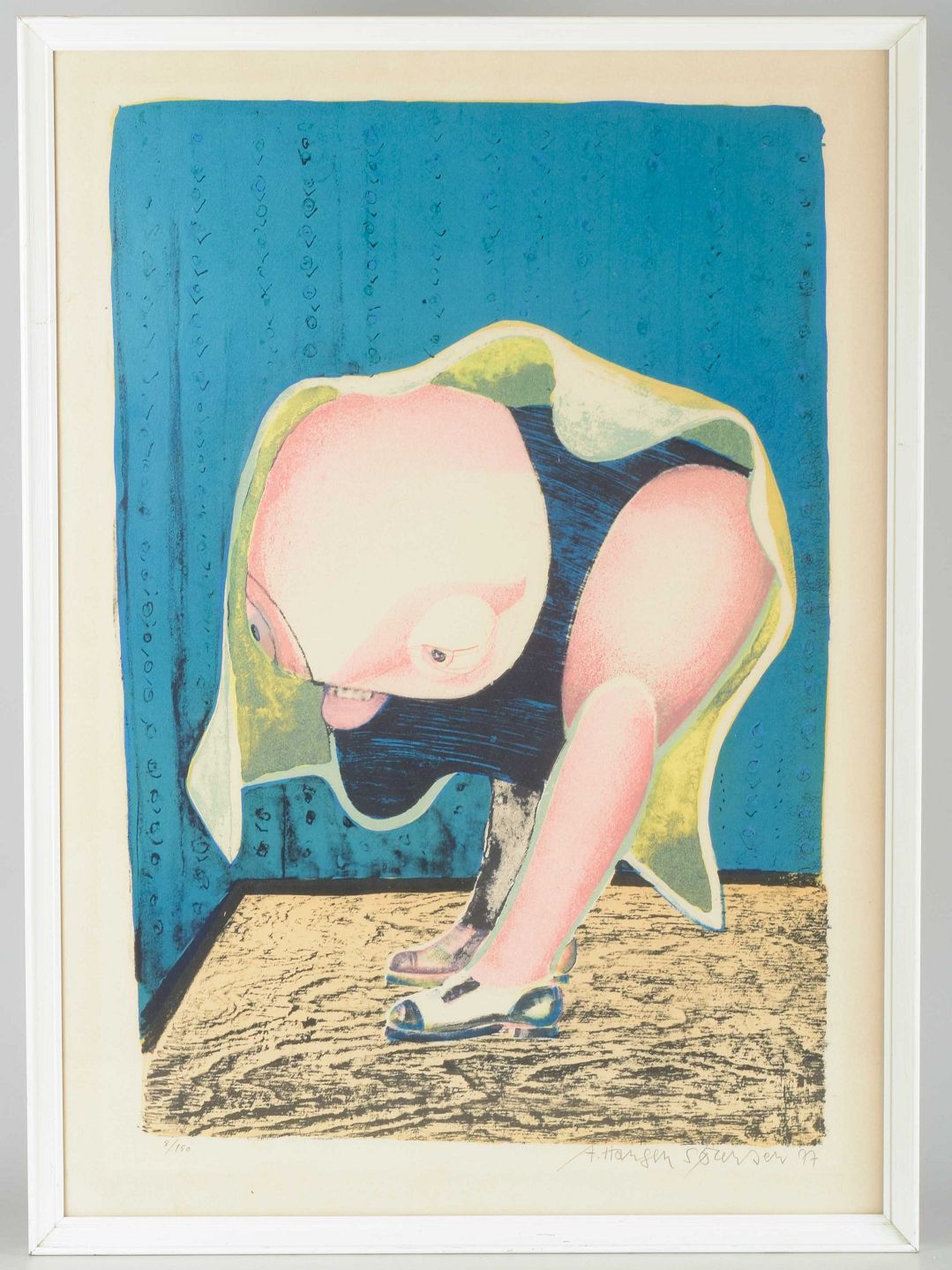 An expressive and figurative lithograph by Arne Haugen Sørensen, executed in 1977. The work is characterised by vibrant contrasts and the artist’s distinctive surrealist imagery.