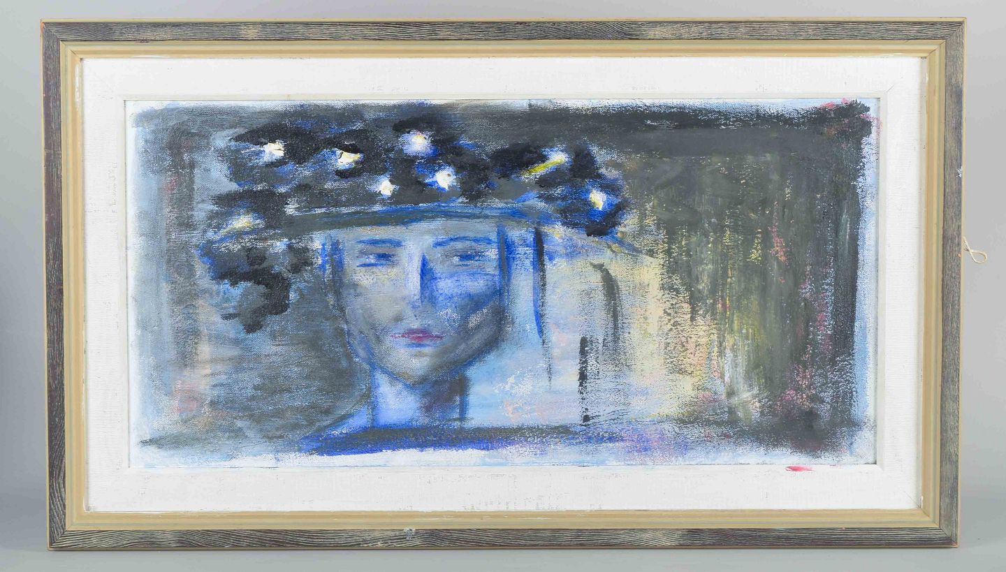 Et ekspressivt maleri med motiv af et kvindeansigt i blå toner, dekoreret med blomsterkrans. Udført ca. 1950’erne-60’erne.