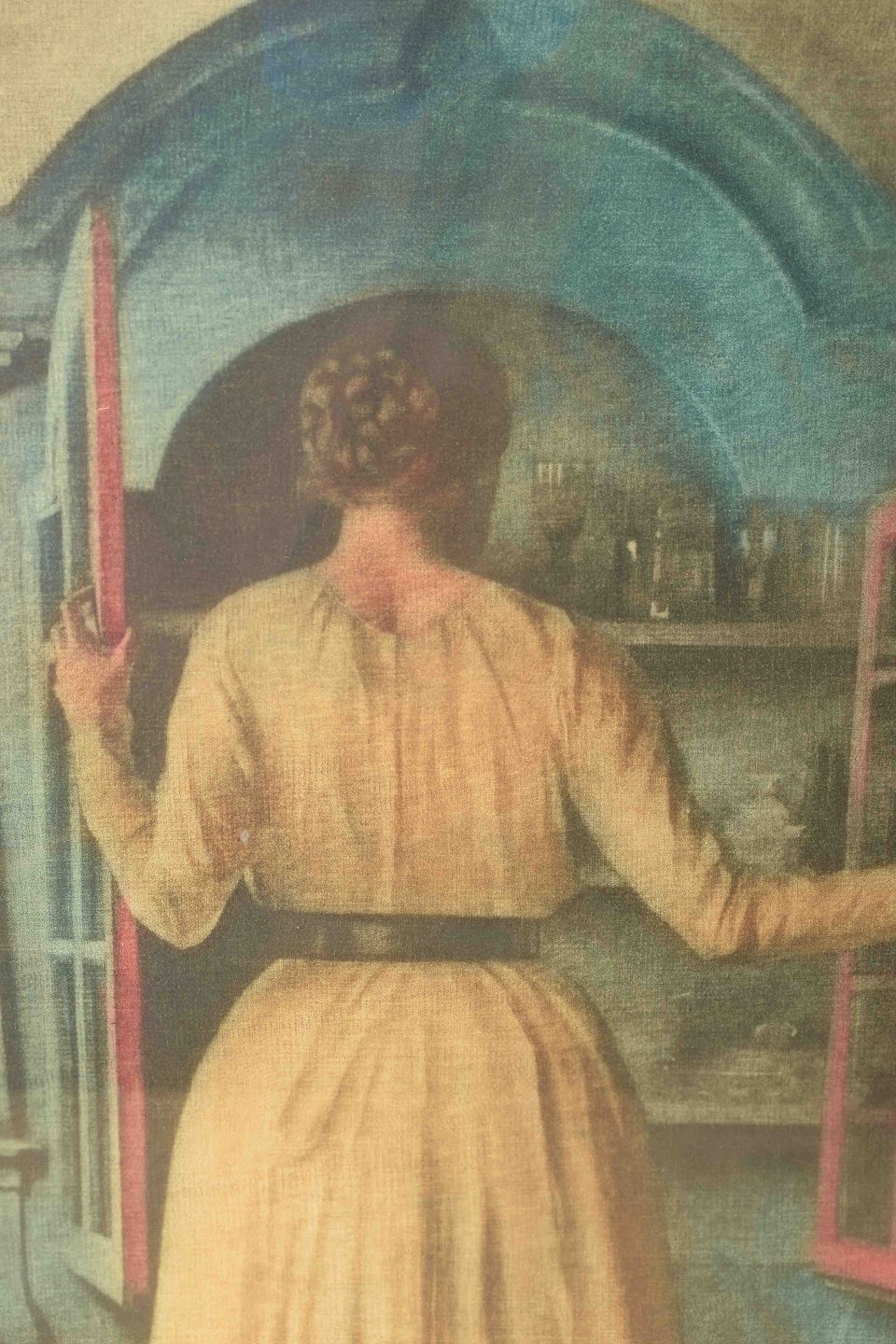 Et stemningsfuldt interiørmotiv af Peter Ilsted, hvor en kvinde står foran et blåmalet vitrineskab med åbne låger. Motivet er karakteristisk for Ilsteds rolige hverdagsscener og hans raffinerede brug af lys, udført i den teknisk krævende mezzotint-teknik.