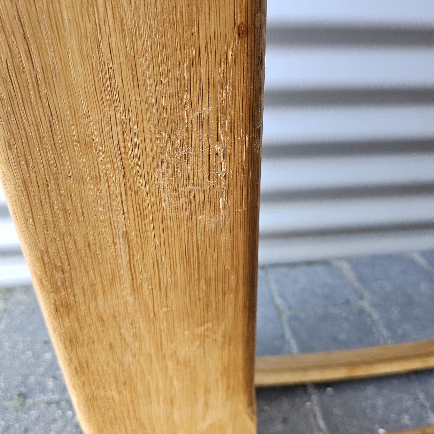 Lænestol med stel i lakeret egetræ og hynder med springfjeder. Hynderne er ny ombetrukket med mørk gråmeleret 180 Hallingdal uld. Model GE 290