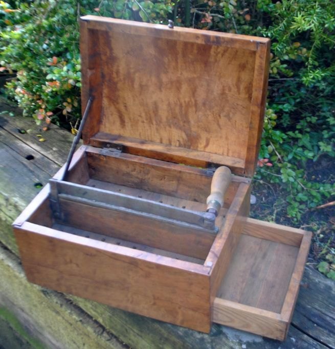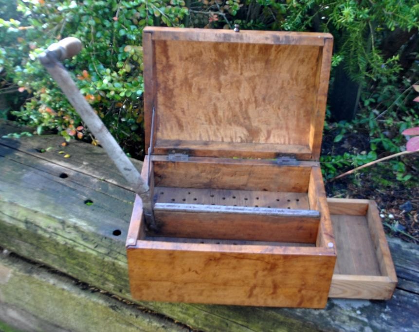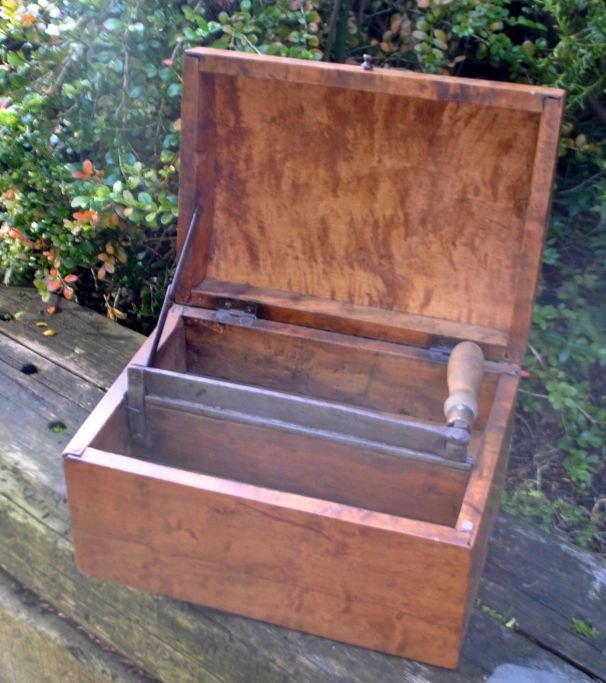 Zuckerdose aus Birkenholz, 19. Jahrhundert. Schweden. Mit gewölbtem Deckel, Hackmesser, perforiertem Boden und Schublade. H: 19 cm. B: 33 cm. T: 24 cm.