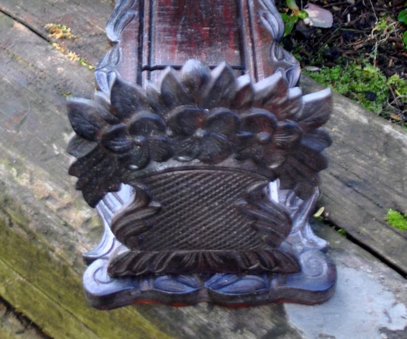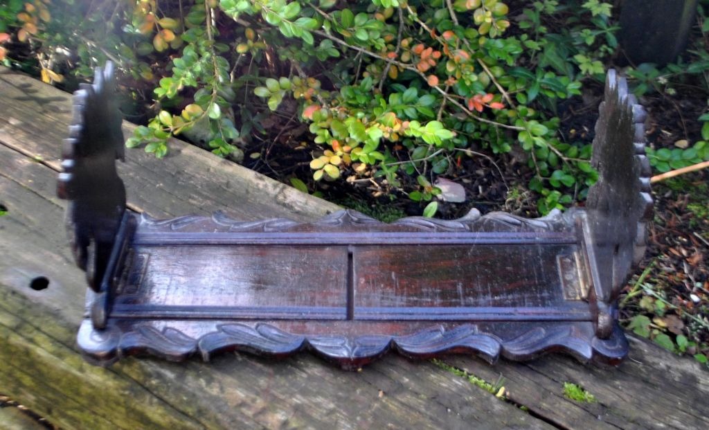 Antiker Reisebücherschrank. 19. Jahrhundert. Wohl Deutschland. Mit Schnitzereien in Form von Körben mit Blumen als Abschluss. H.: 21 cm. Länge aufgebaut: 44 cm. Länge ausgeklappt: 83 cm.