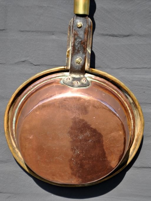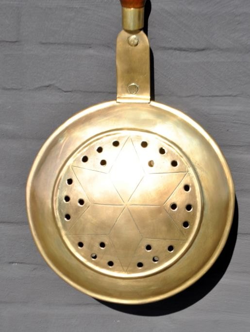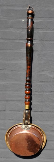 Heizbecken aus Kupfer und Messing, 19. Jahrhundert. Messingdeckel mit Sterndekor. Der Messingdeckel ist neuer als der Sockel. Holzgriff. Gestempelt. L: 100 cm. Durchmesser: 29 cm.