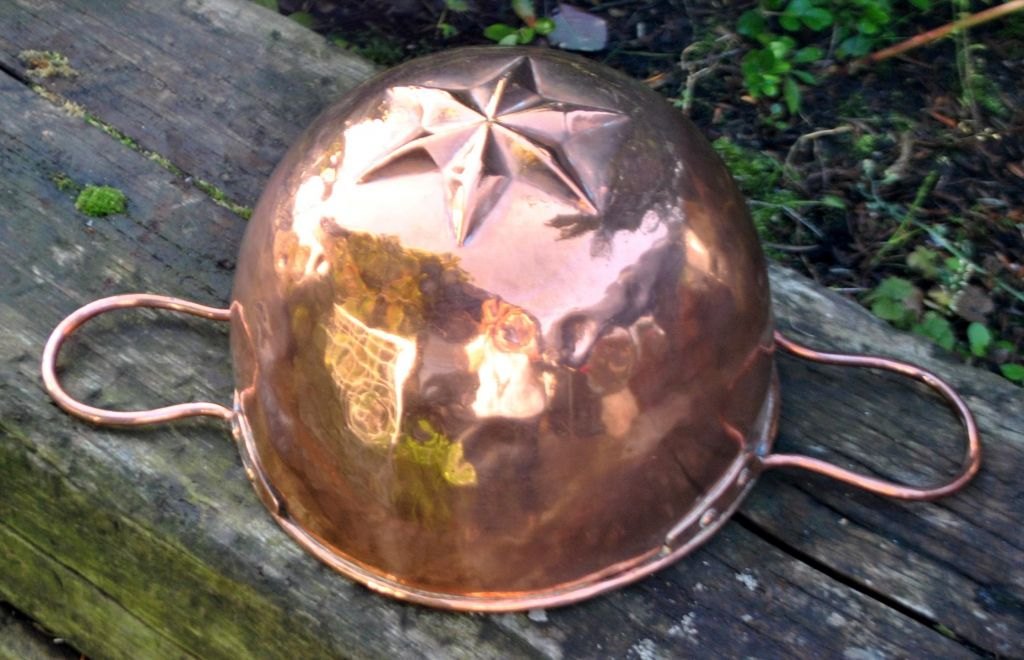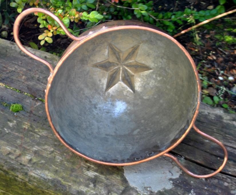 Pateten- oder Fleischgericht, Kupfer, 19. Jahrhundert. Dänemark. Mit zwei Henkeln und sternförmiger Verzierung. Durchmesser: 21,5 cm. Durchmesser inkl. Henkel: 37,5 cm. H: 14 cm. Keine sichtbaren Stempel.