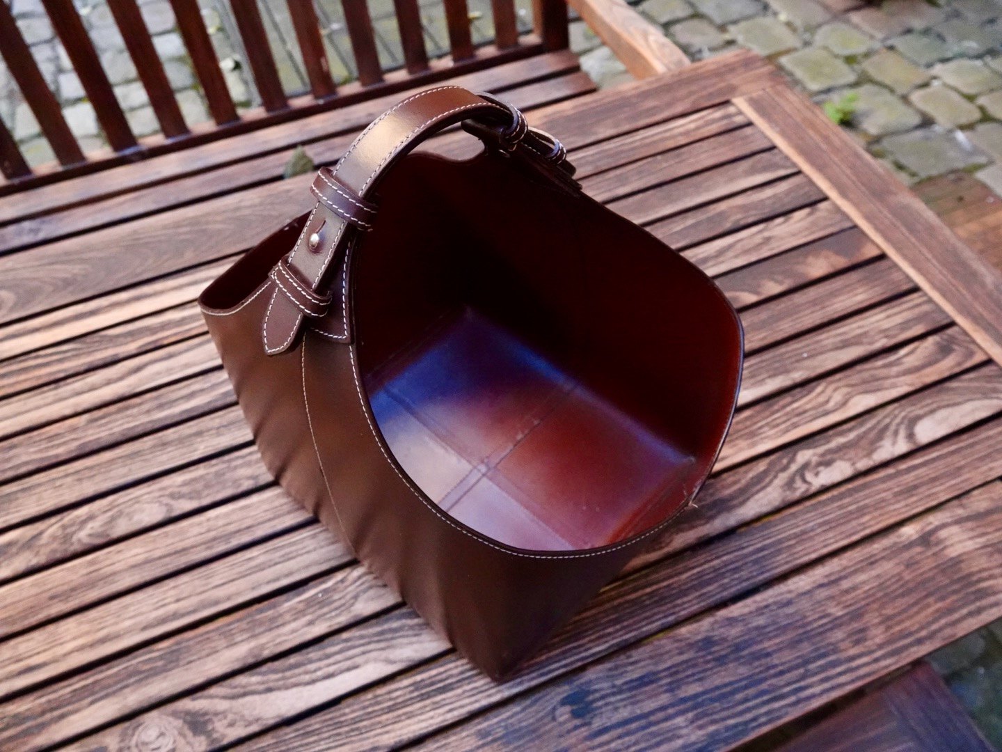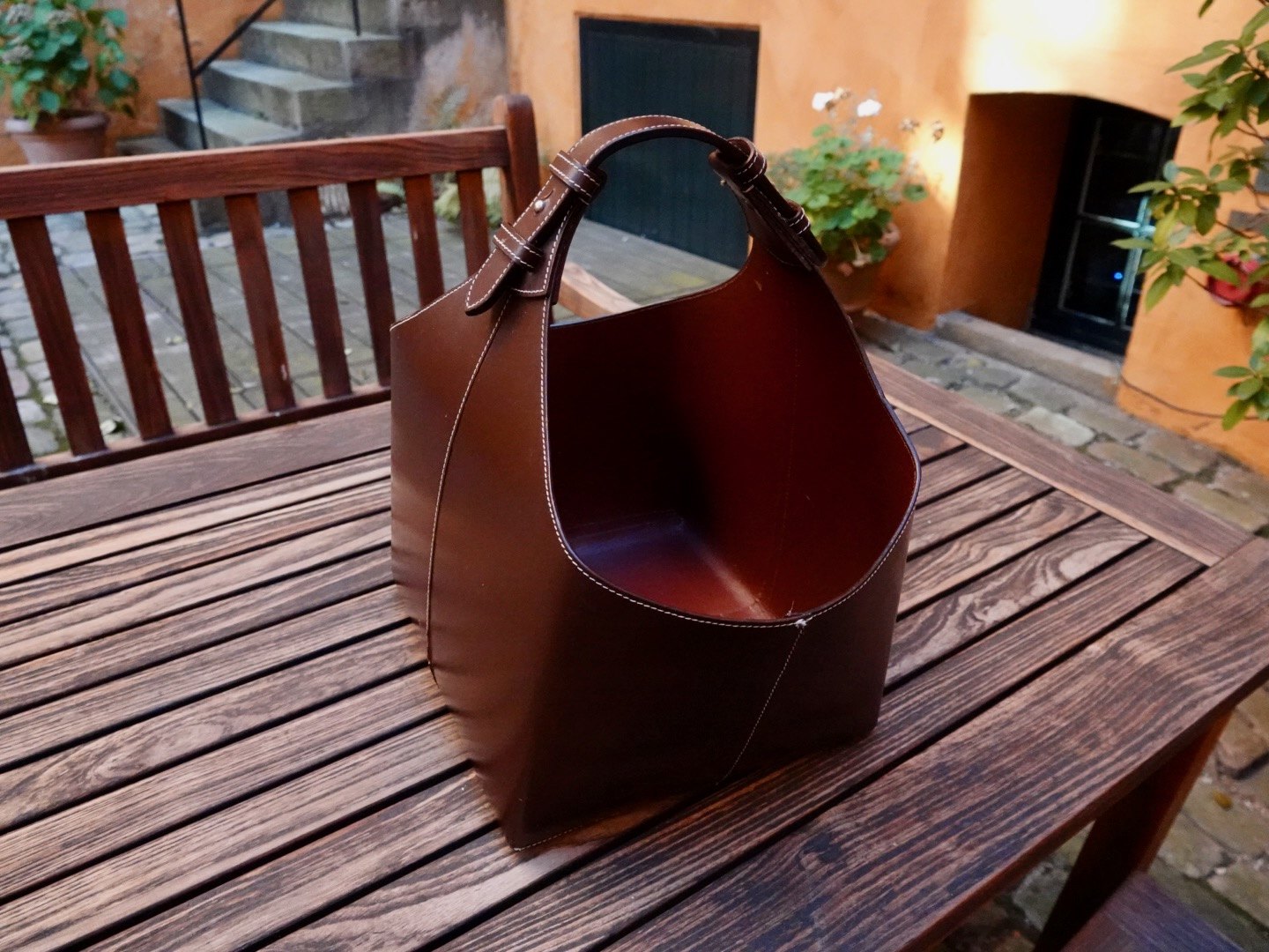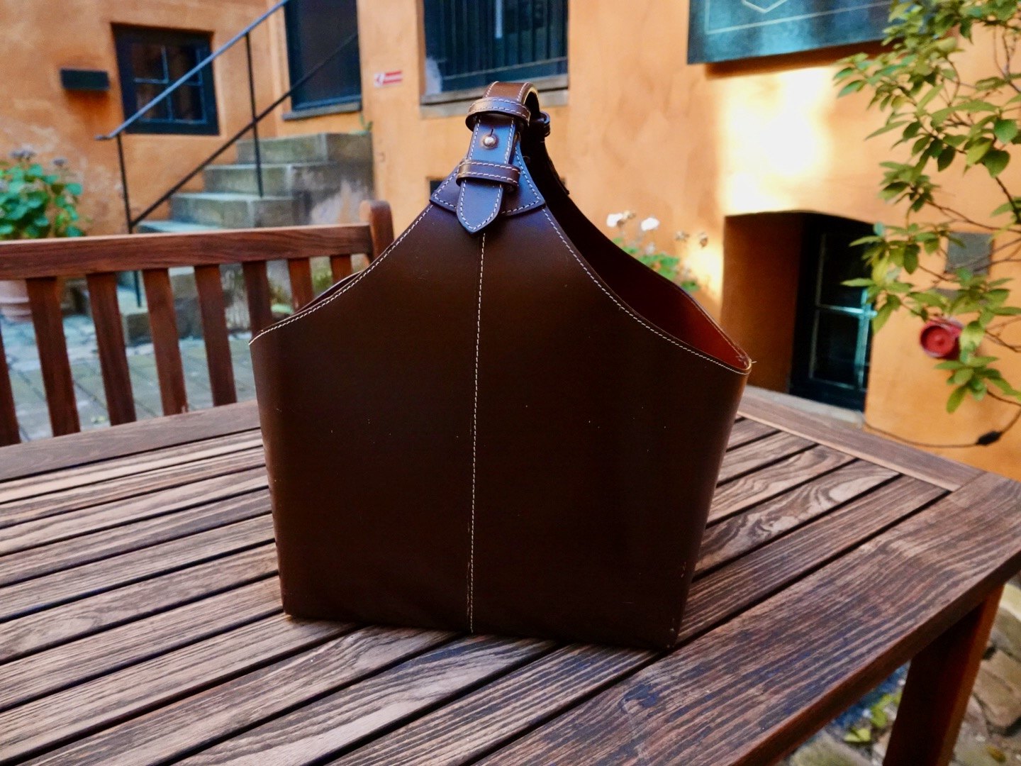Magasinholder / brændekurv i brunt kernelæder.