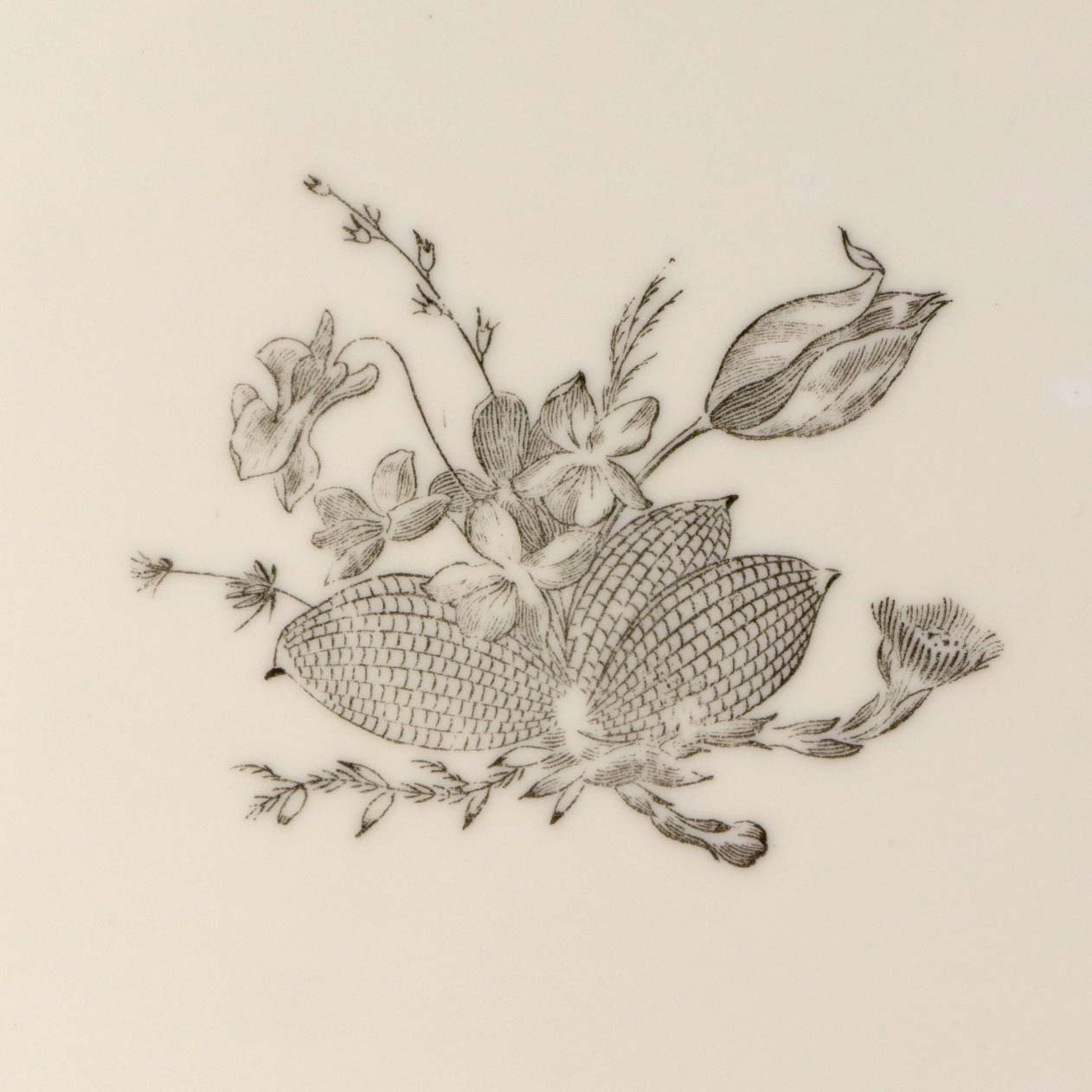 Service i glat cremefarvet porcelæn med grøn og sort kantstreg samt dekoration af blomster og grene i sort streg.