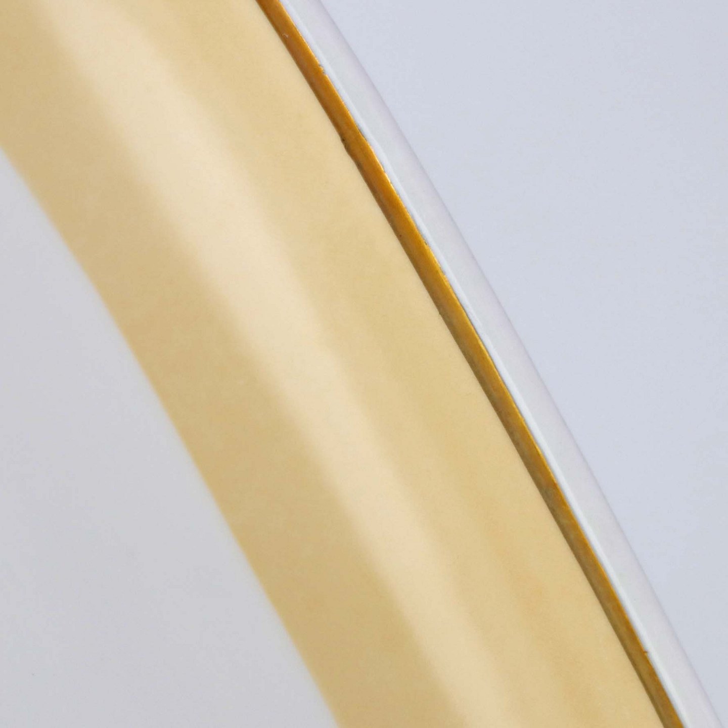Service i glat hvid porcelæn med sandfarvet dekoration og gylden kant.