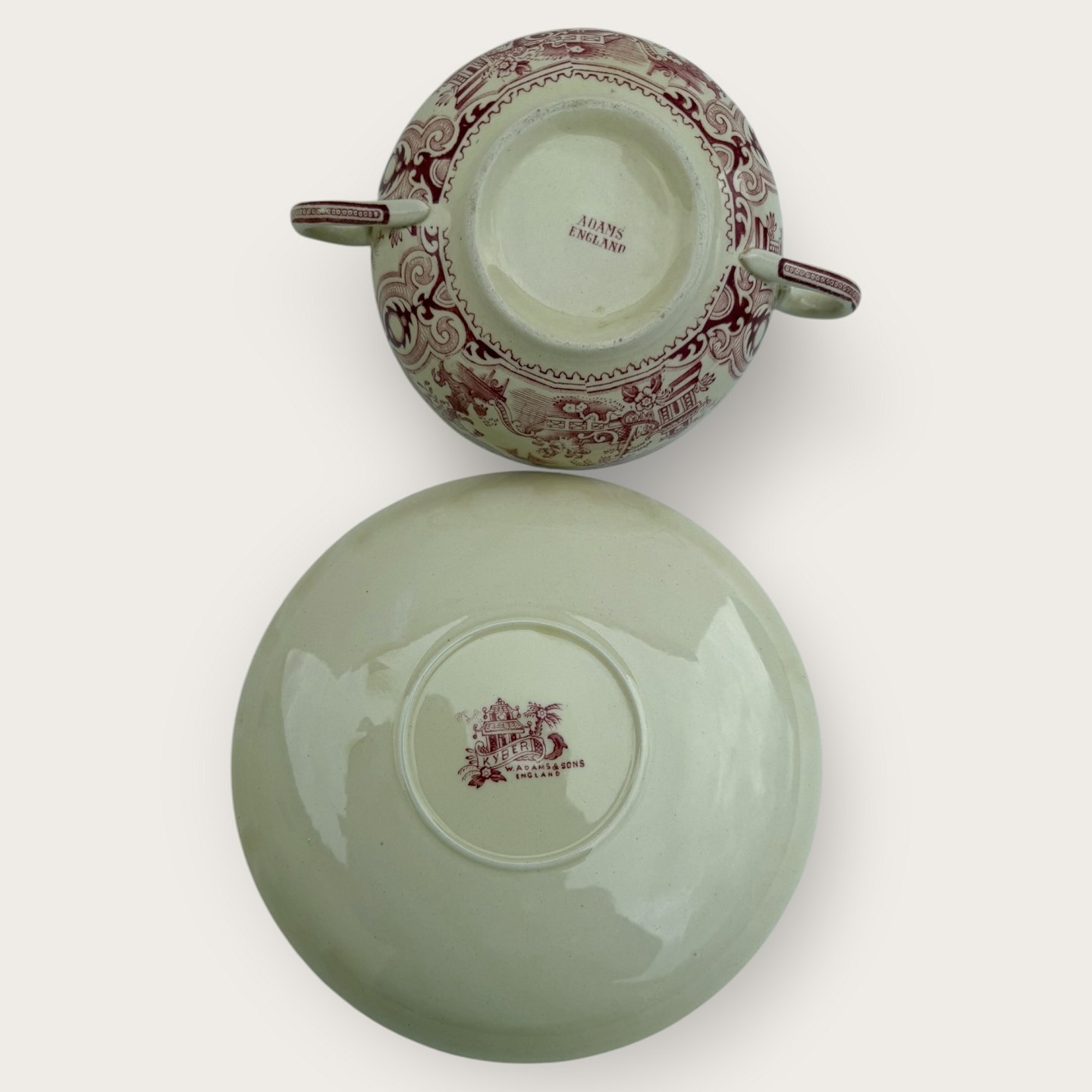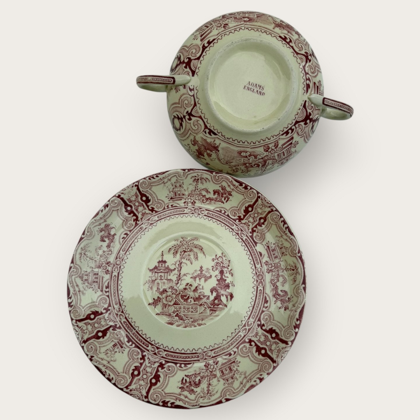 William Adams, Kyber med rødt kinesisk motiv, Bouillonkop, Kop diameter 12cm, underkop17cm, pæn brugt stand.