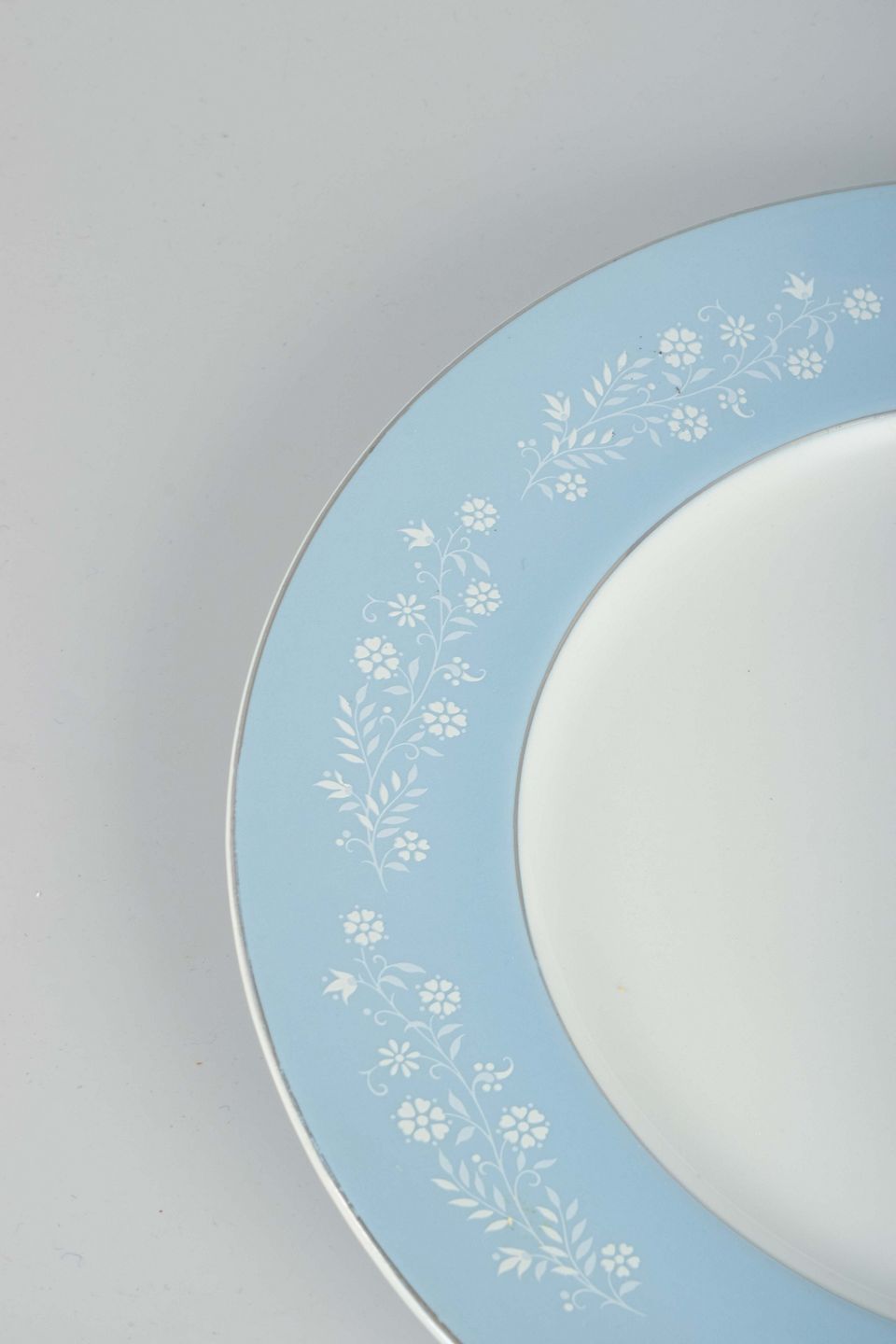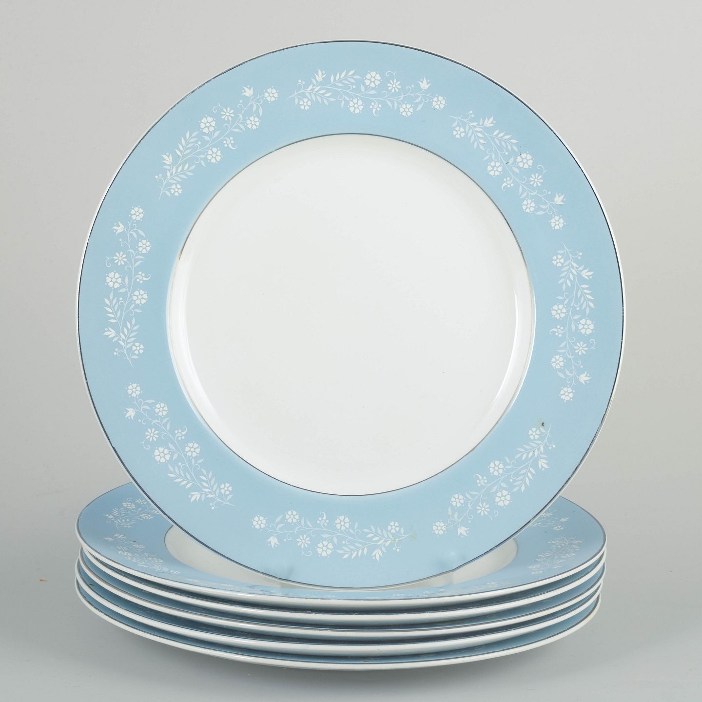Sæt á seks middagstallerkener i fajance med blå kant dekoreret med hvide blomster og sølvfarvet rand.