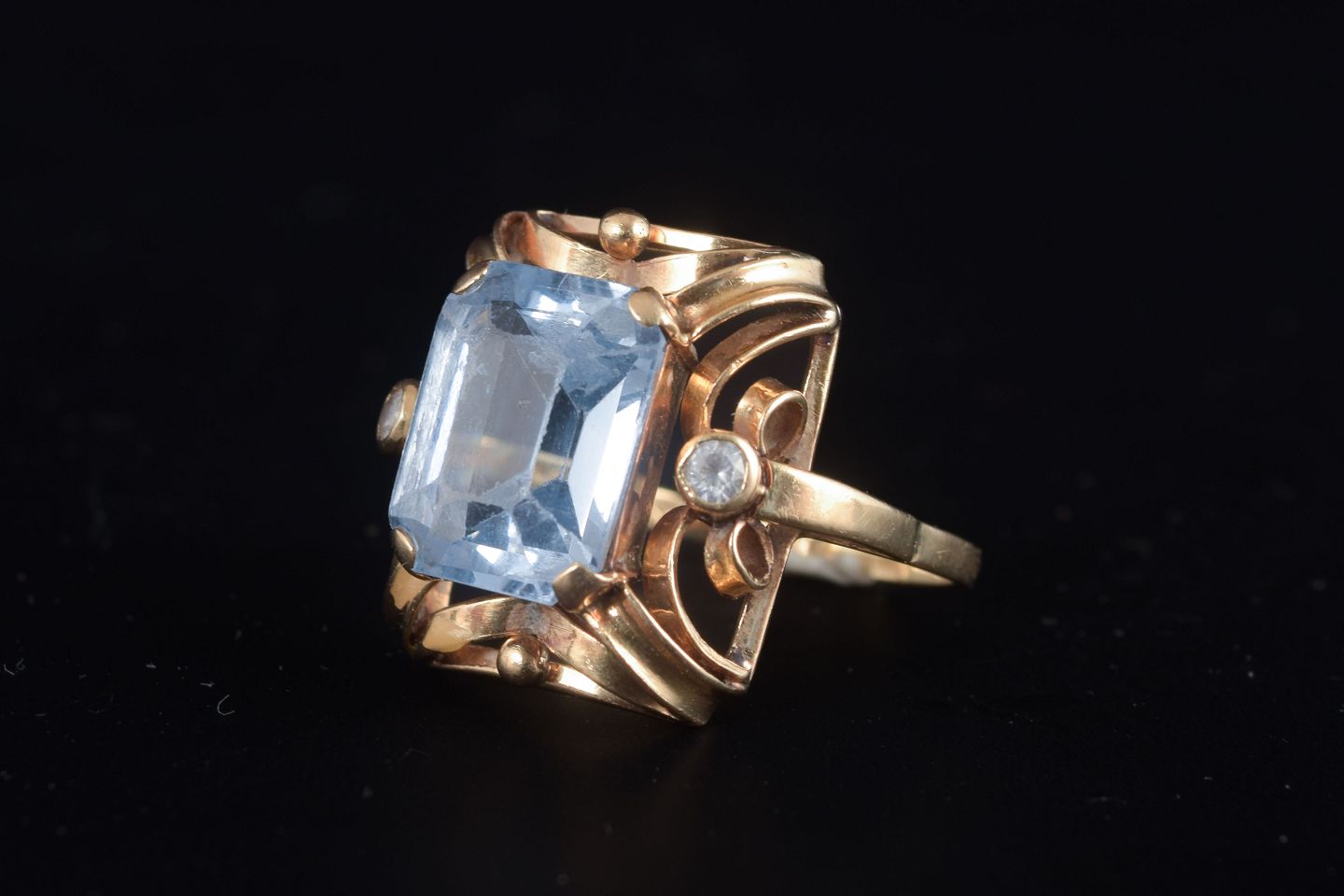 Dekorativ ring i 18 karat guld udført af dansk guldsmed med organisk, skulpturel fatning. Monteret med en lyseblå, firskåret spinel, der giver ringen et elegant og sofistikeret udtryk.