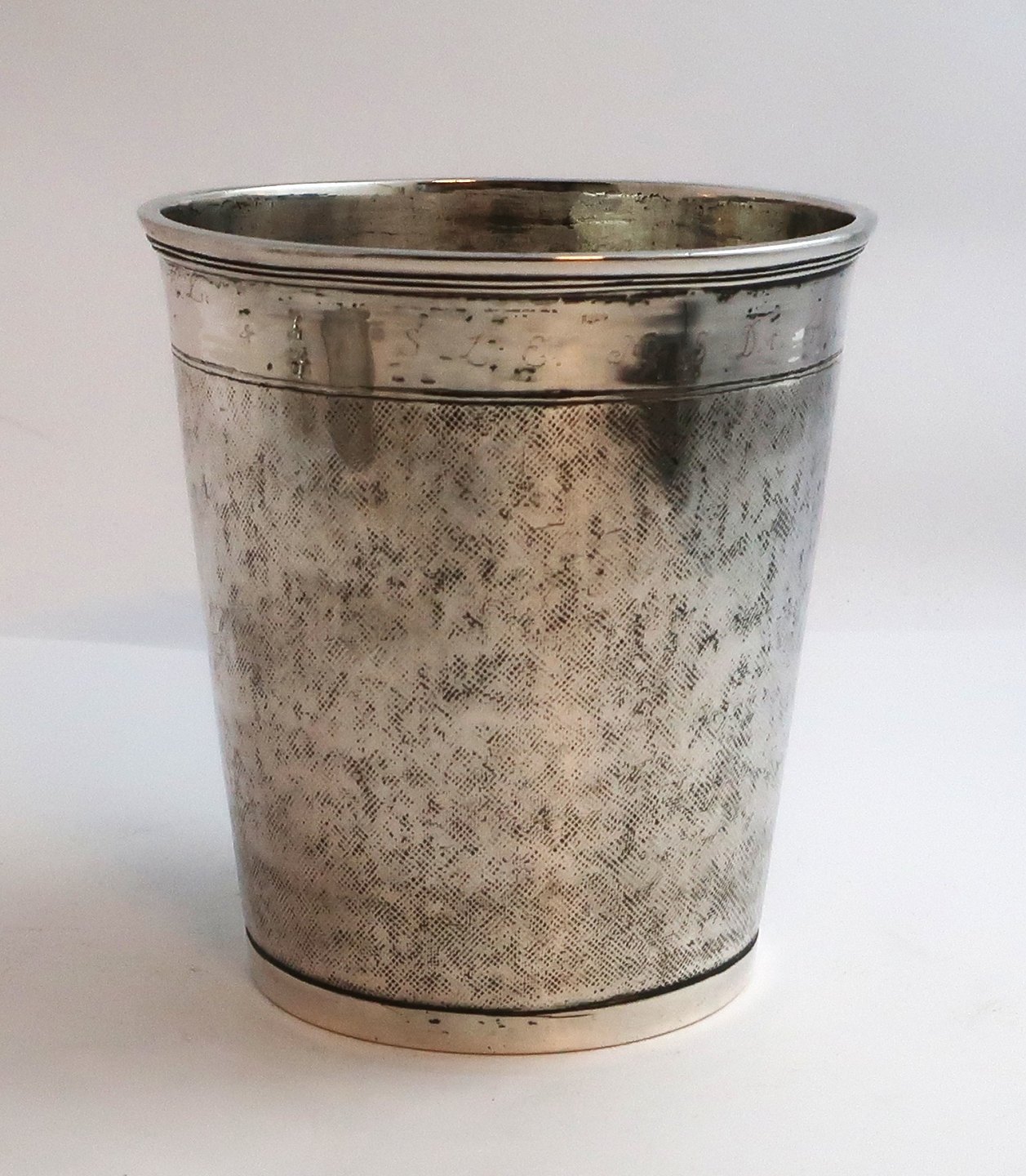 Stort sølvbæger. Sølv mester ukendt. Indgravering fra 1756. Højde 11 cm. Diameter 10 cm.