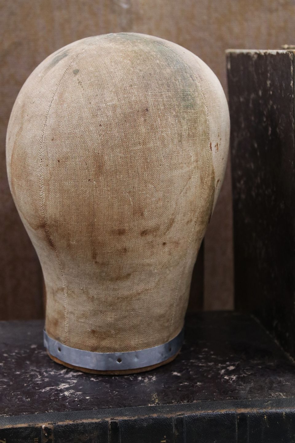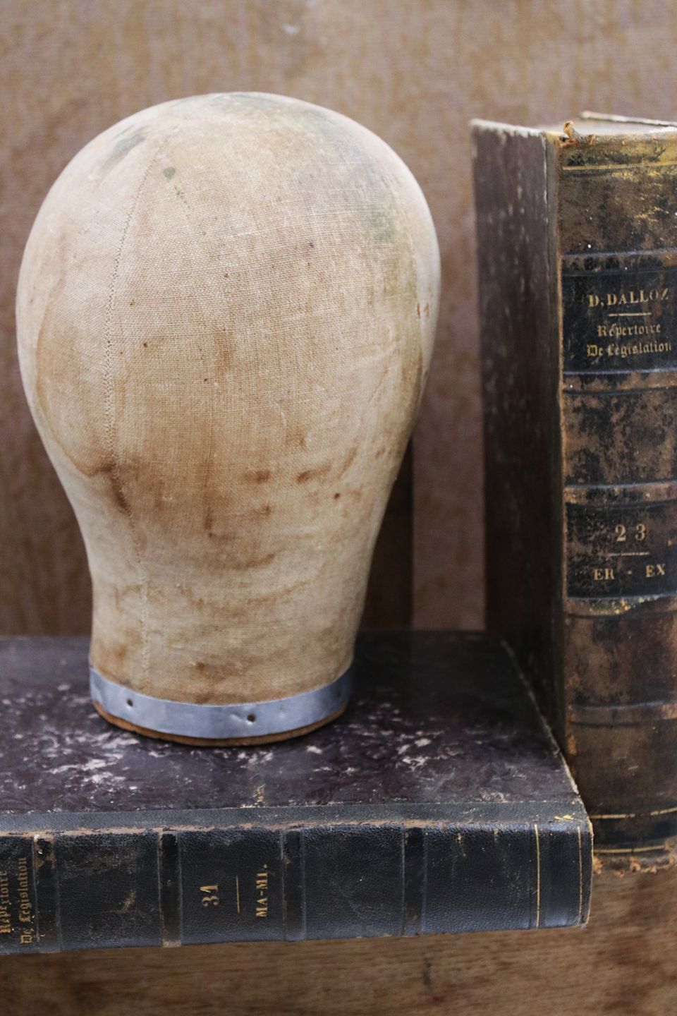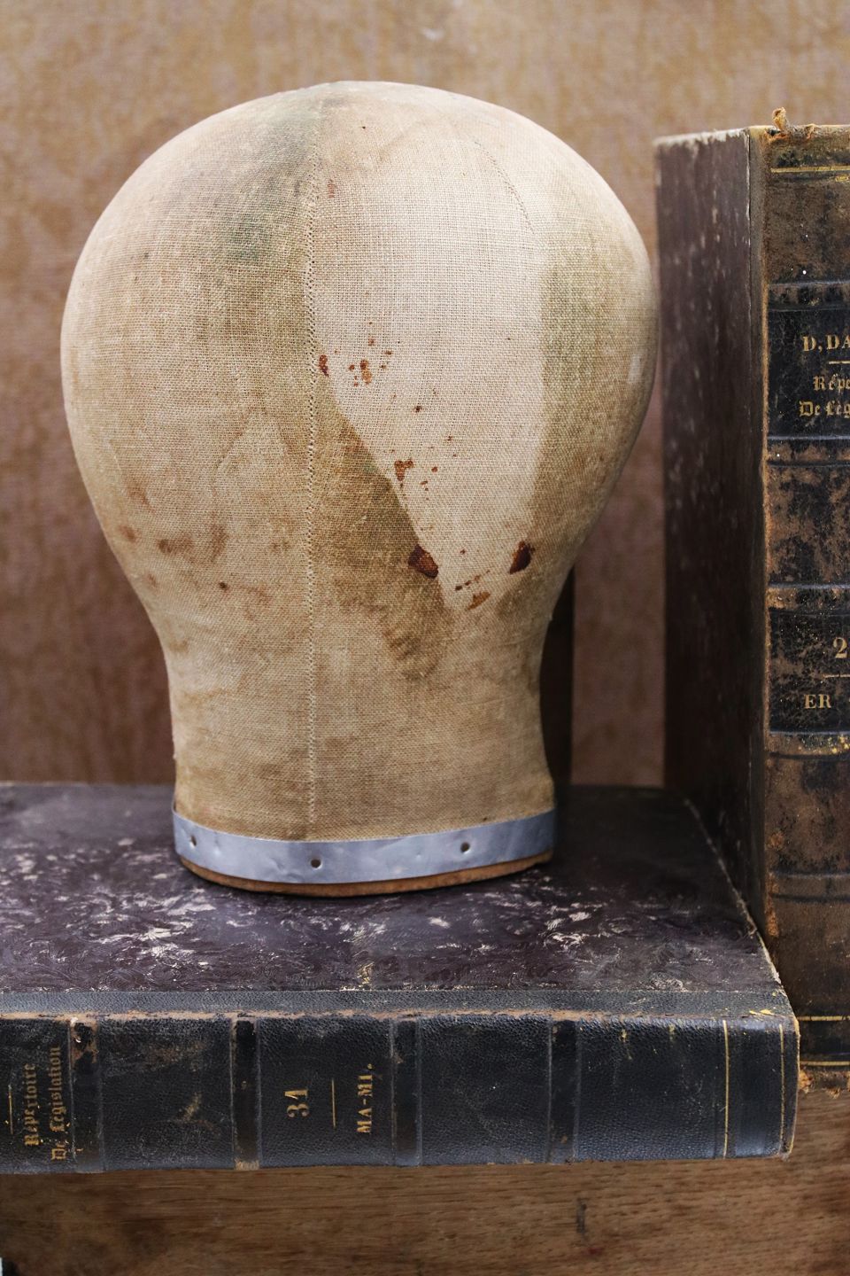 Dekorativt , gammelt fransk hatte hoved i træ og beklædt med råt stof...