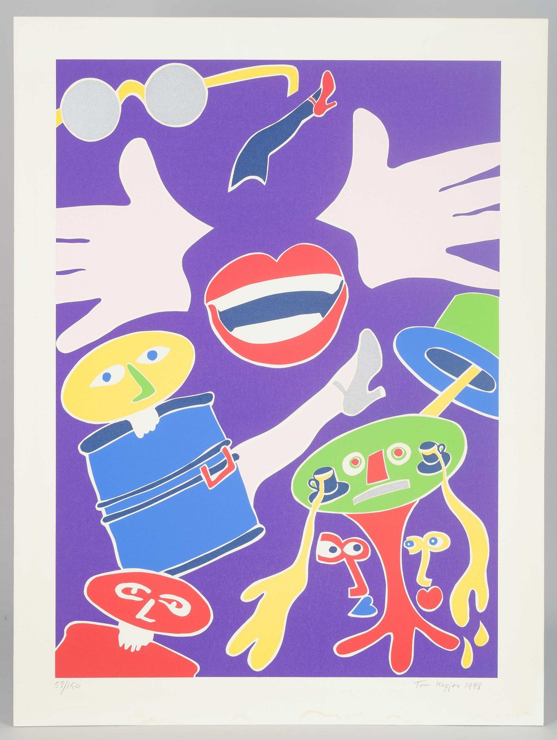 Kompositorisk og fabulerende motiv med surrealistiske figurer, hænder, mund og stiliserede hoveder i stærke kontrastfarver. Værket udstråler Krøjers karakteristiske leg med popkunst, humor og visuel poesi, hvor flader og figurer brydes op i en livfuld, fortællende helhed.