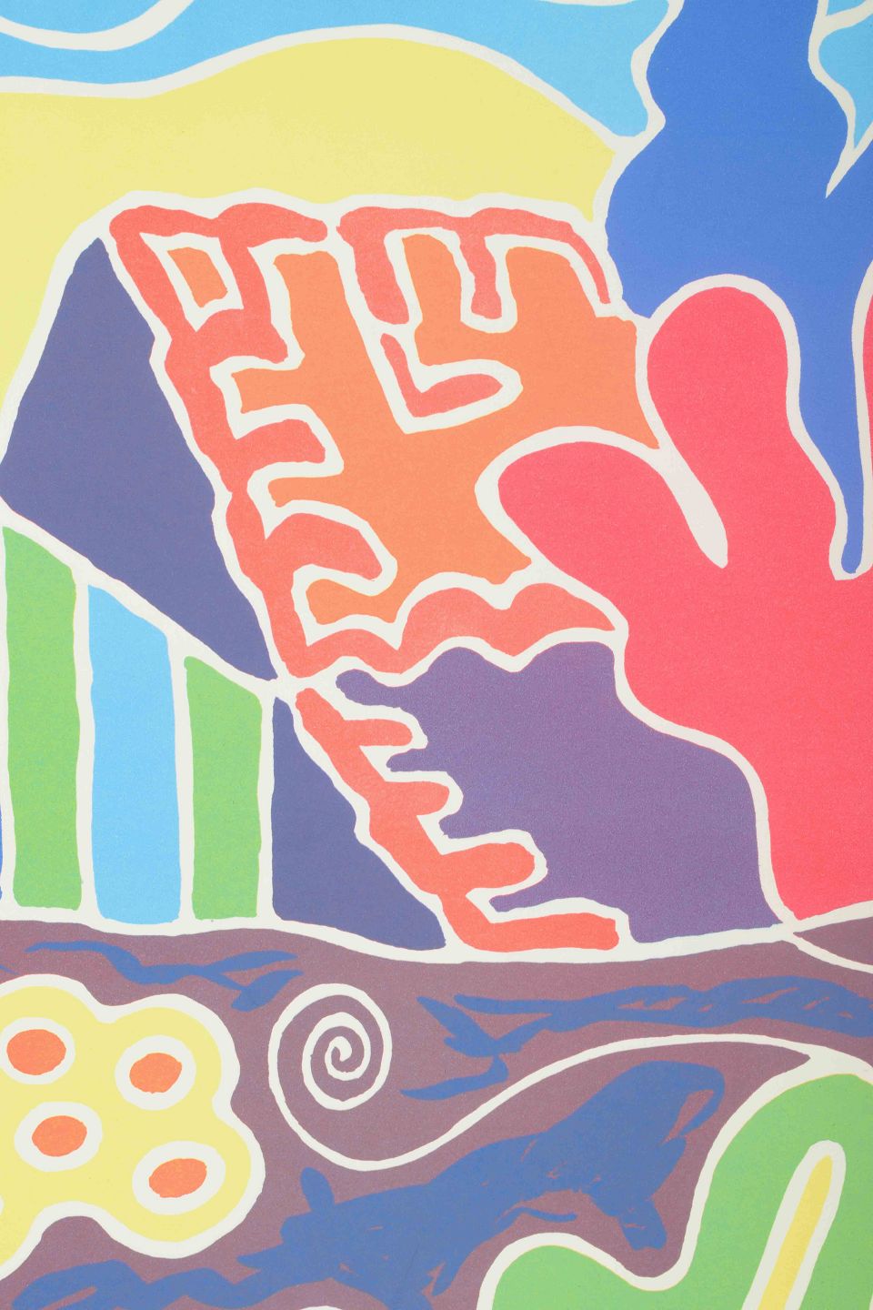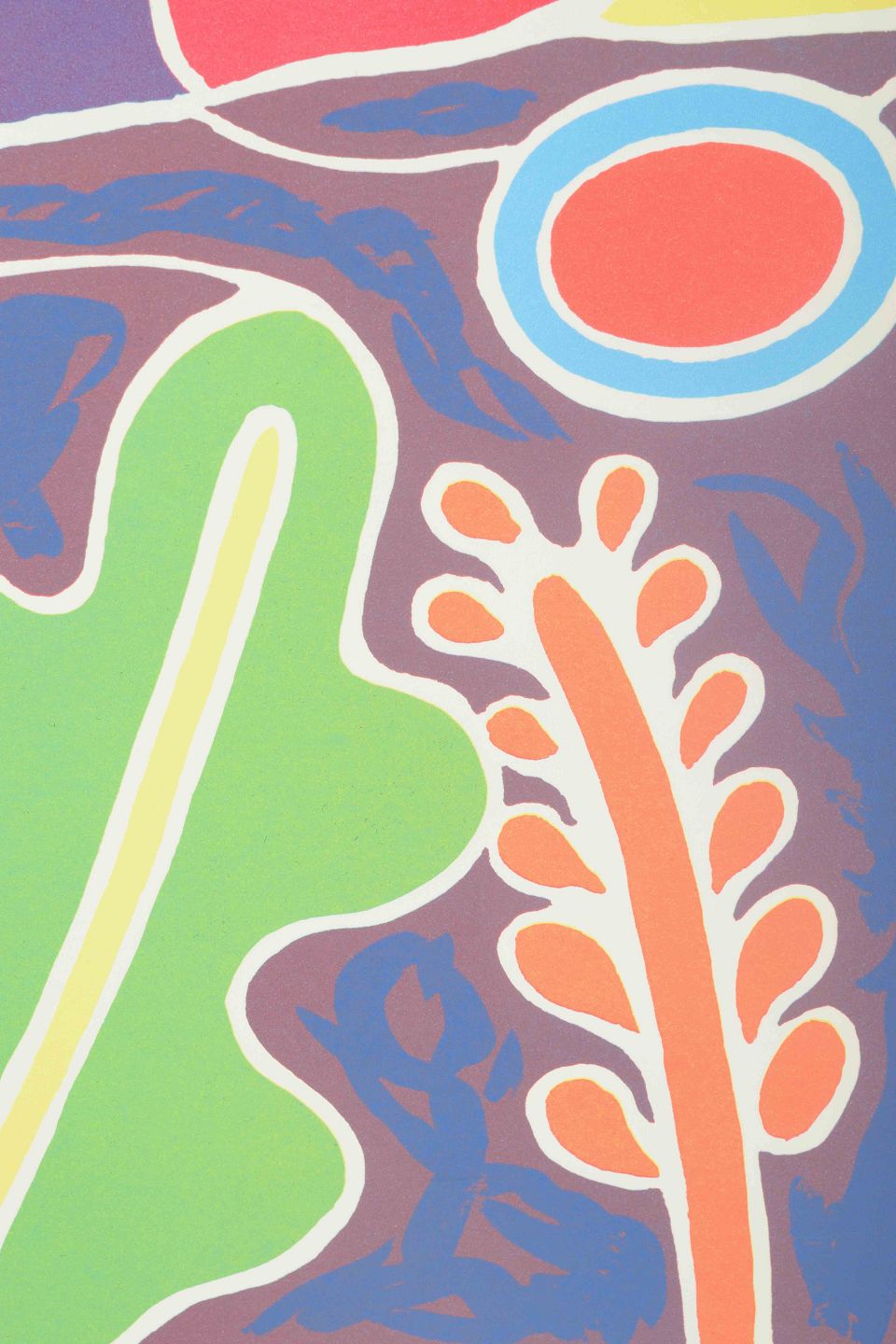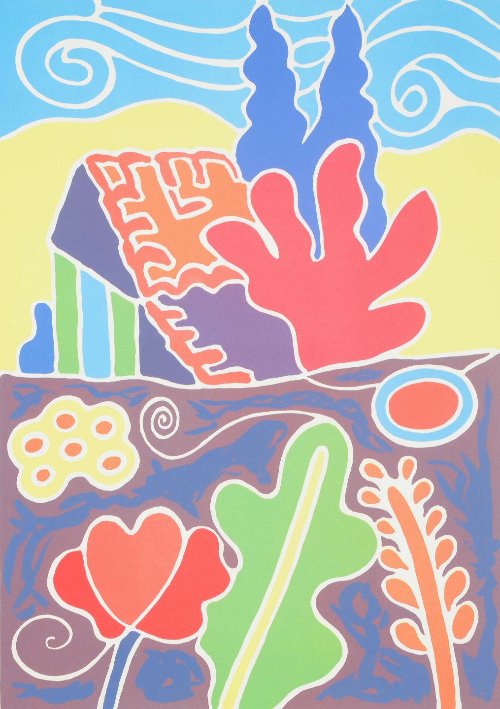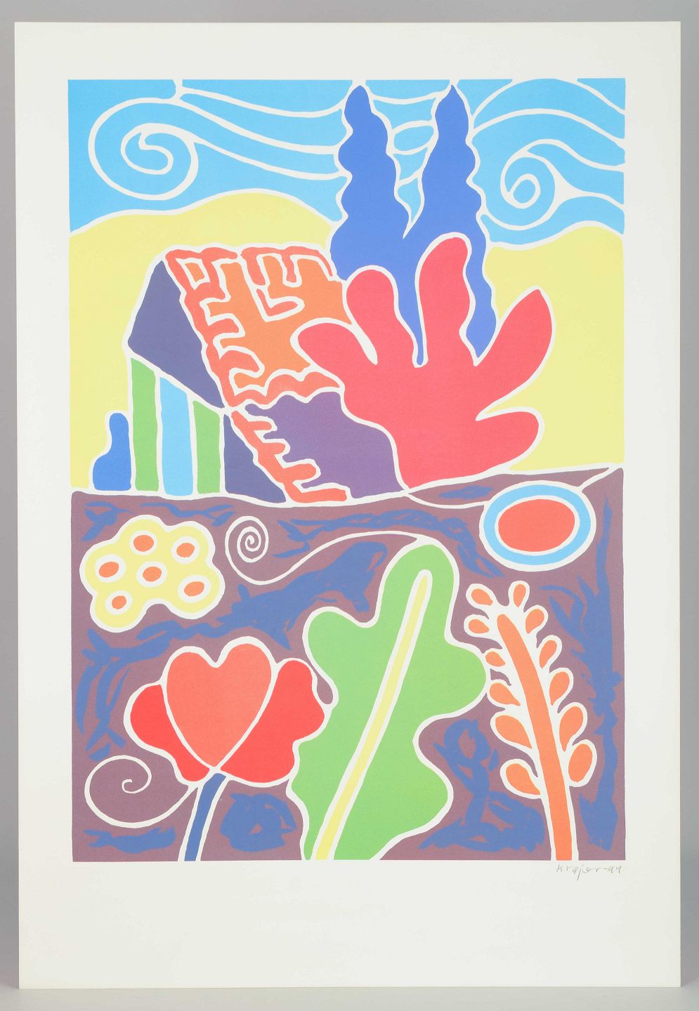 Farverigt og dekorativt komposition med hus, træer og blomster i et stiliseret formsprog. Værket bærer præg af Krøjers karakteristiske leg med farveflader, kontraster og organiske konturer, som skaber en umiddelbar og livfuld stemning.