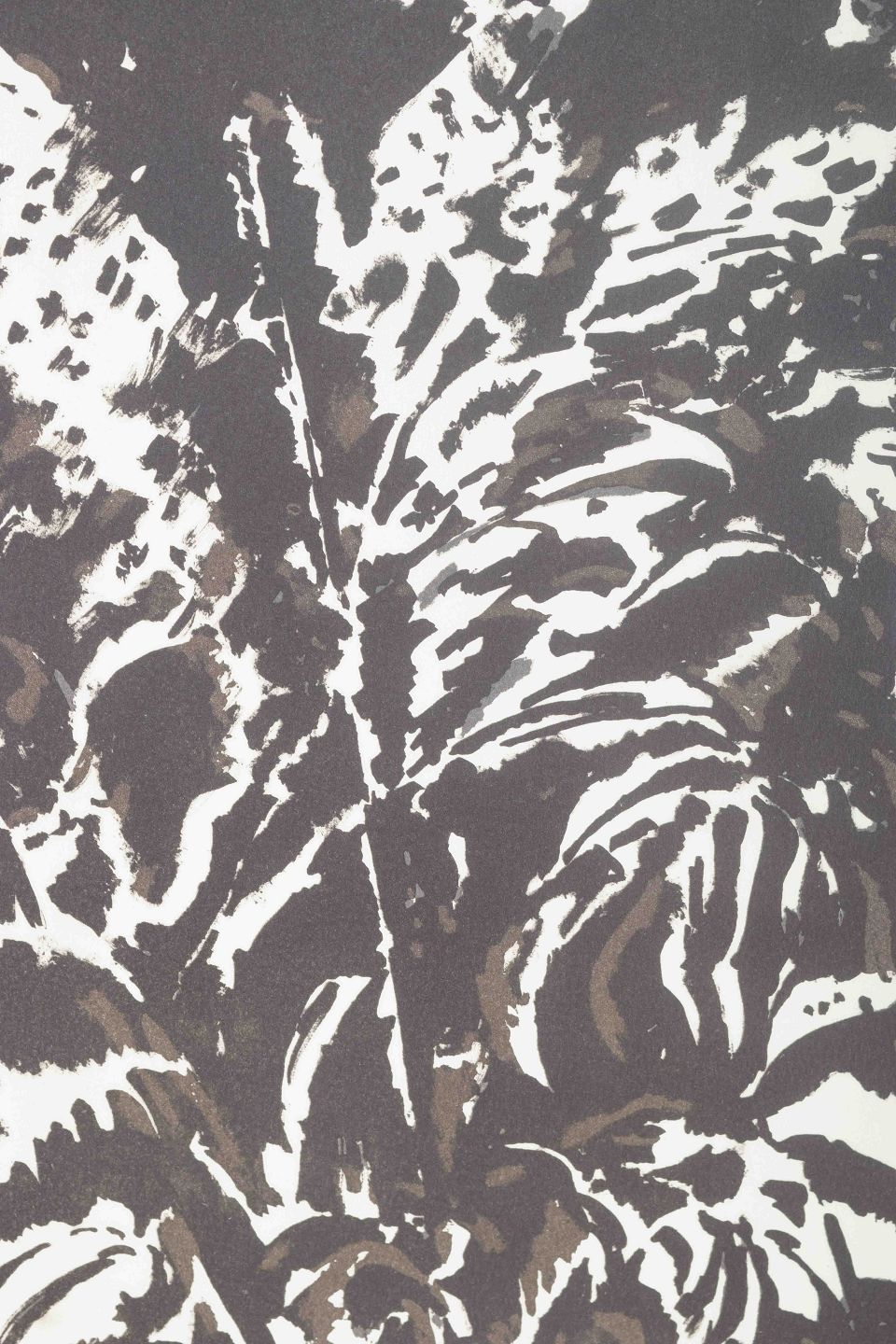 Motiv med stiliseret plante i rund vase, udført i dæmpede jordfarver og kontrasterende flader. Et dekorativt og harmonisk værk, hvor den grafiske bearbejdning af bladene skaber et levende spil mellem lys og skygge.