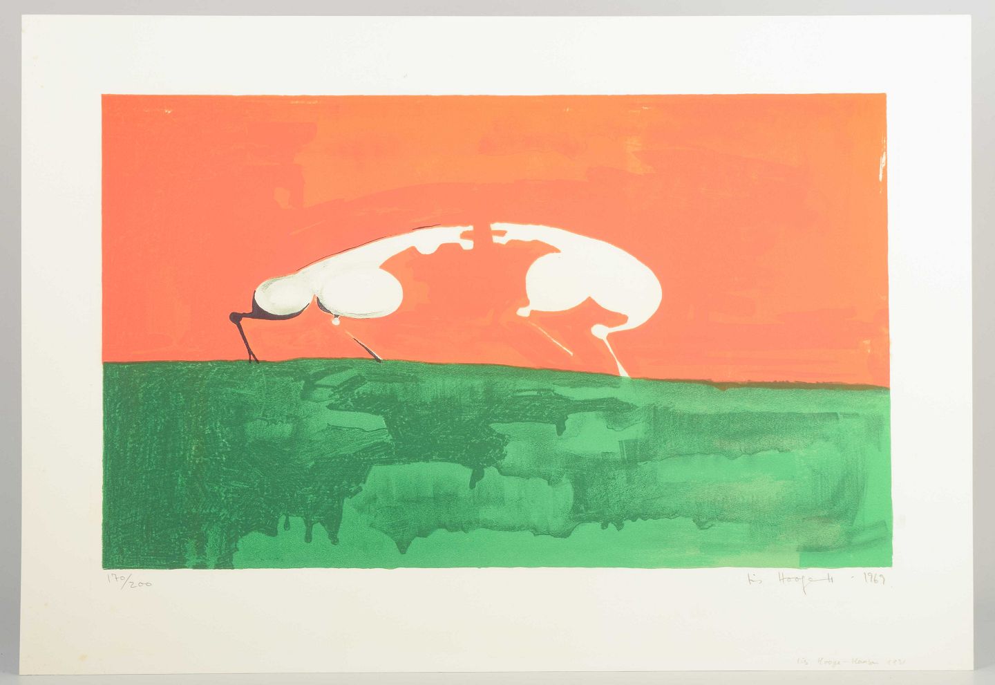 To stiliserede fugle i hvid silhuet, placeret mod en stærk orange baggrund og grøn forgrund. Den enkle, men kraftfulde farvekontrast skaber en dynamisk og poetisk stemning. Værket er nummereret 170/200 og signeret samt dateret 1969.