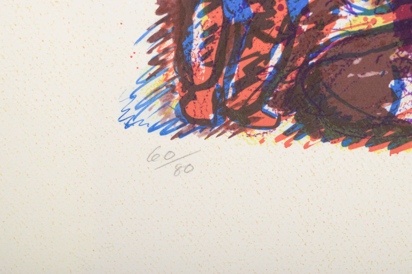 Et ekspressivt værk præget af kraftige penselstrøg og intense farver i rød, blå, lilla og brun, hvor organiske og figurative former flyder ind i hinanden. Kompositionen bærer præg af kunstnerens abstrakt-ekspressionistiske, koloristiske billedsprog med tydelig dynamik og bevægelse i motivet.
