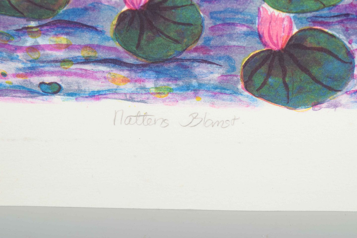 Et stemningsfuldt og farverigt værk, hvor en kvindelig figur ligger under nattehimlen omgivet af åkander og blomster i et drømmeagtigt landskab. Værket er præget af Winthers karakteristiske organiske former og sanselige billedsprog.