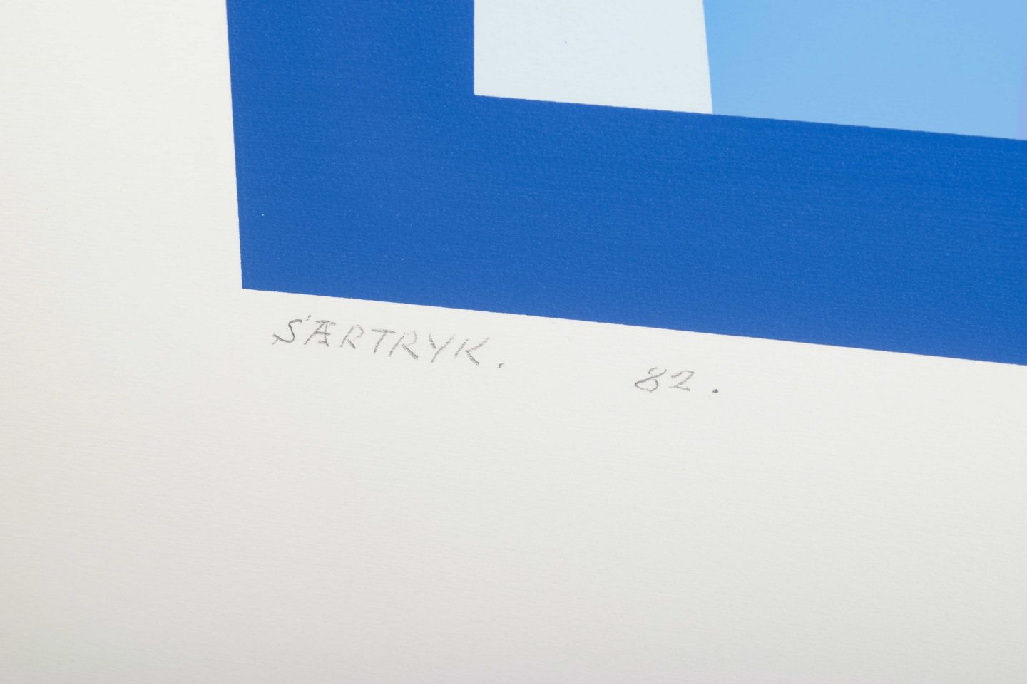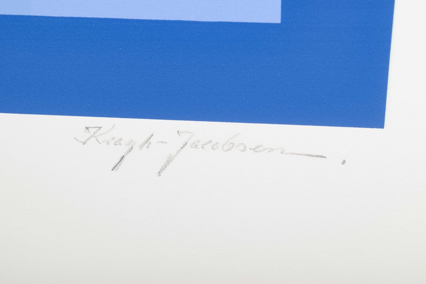 Et geometrisk-abstrakt værk i blå og violette farvetoner, brudt af grønne og lilla cirkelformer. Kompositionen er karakteriseret ved klare farveflader og præcist afbalancerede former, der fremhæver Kragh-Jacobsens konstruktive billedsprog, hvor farve og form spiller den afgørende rolle.