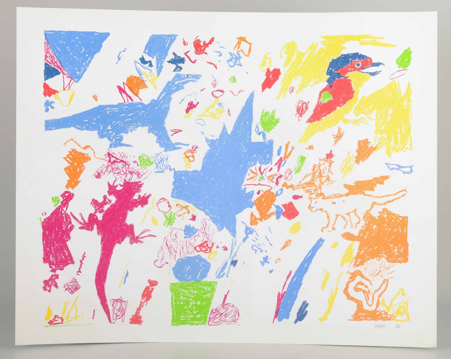 Et fantasifuldt og farverigt værk med figurer, der minder om dyr og fugle, udført i stærke kontrastfarver. Kompositionen har et legende og spontant udtryk med inspiration fra naturens former.