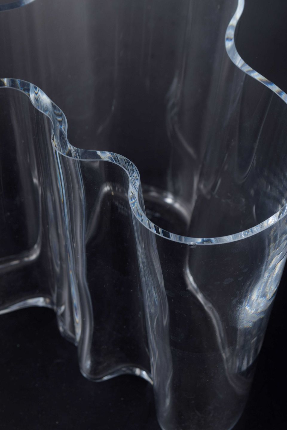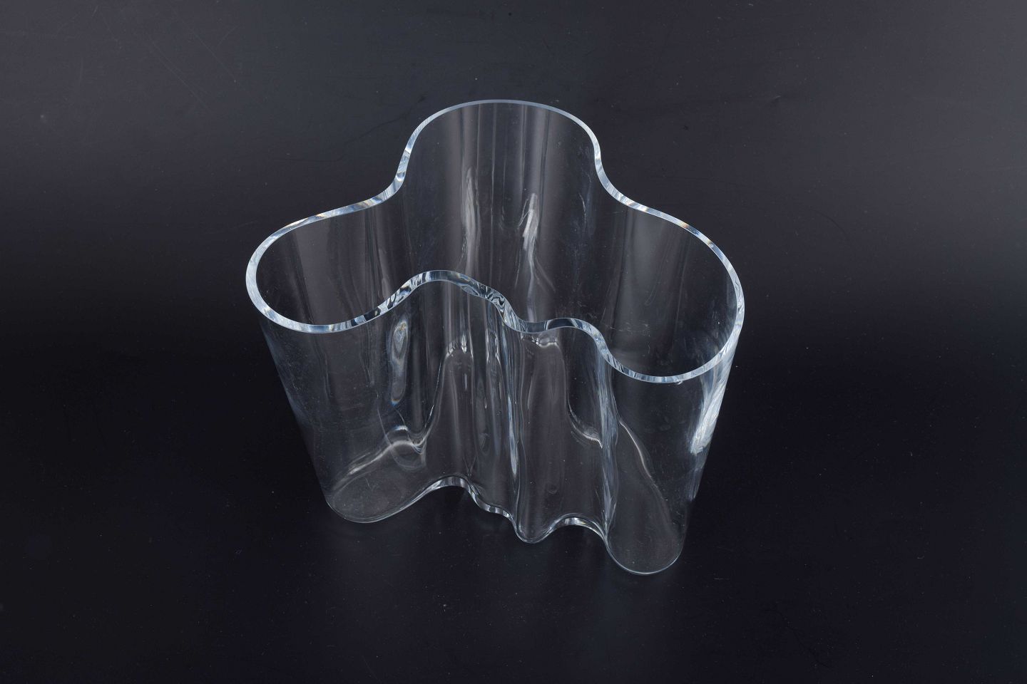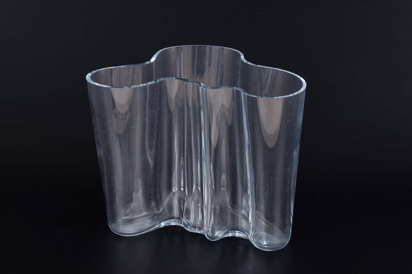 Organisk formet glasvase, kendt som Savoy-vasen, designet af Alvar Aalto og fremstillet af Iittala. Den ikoniske form med bløde, bølgende linjer er et hovedværk i skandinavisk designhistorie.
