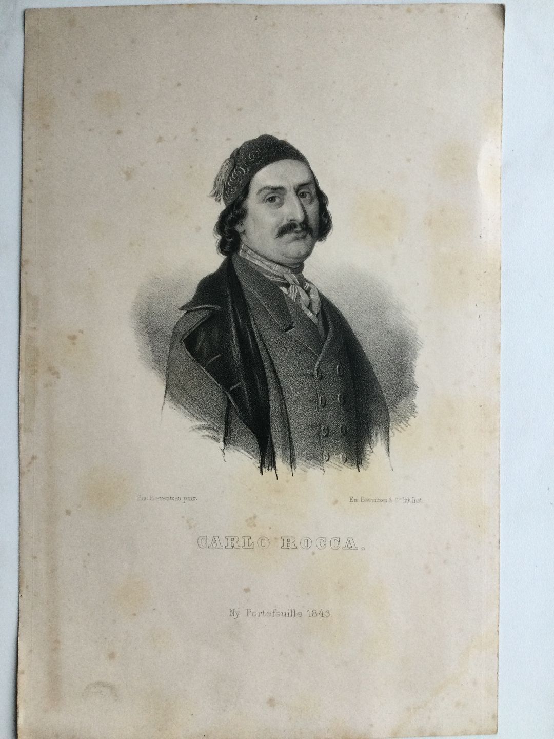 Litografi af Em. Bærentzen - Portræt af Operasanger Carlo Rocca 1843.