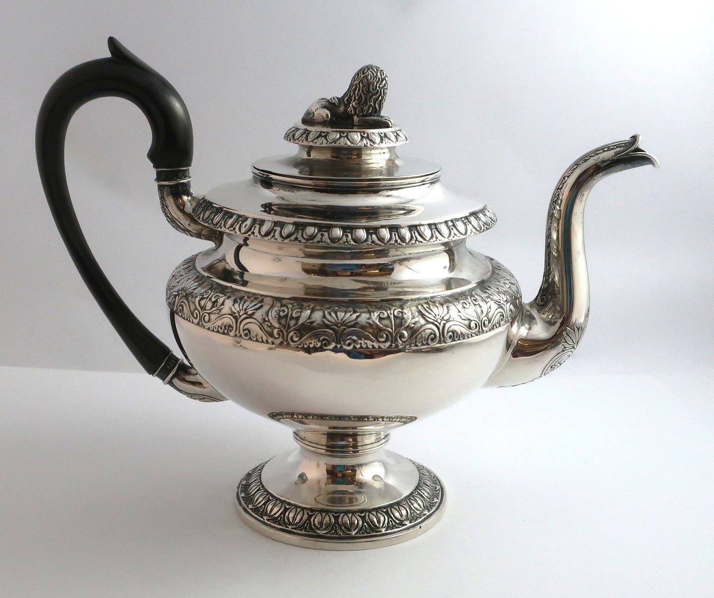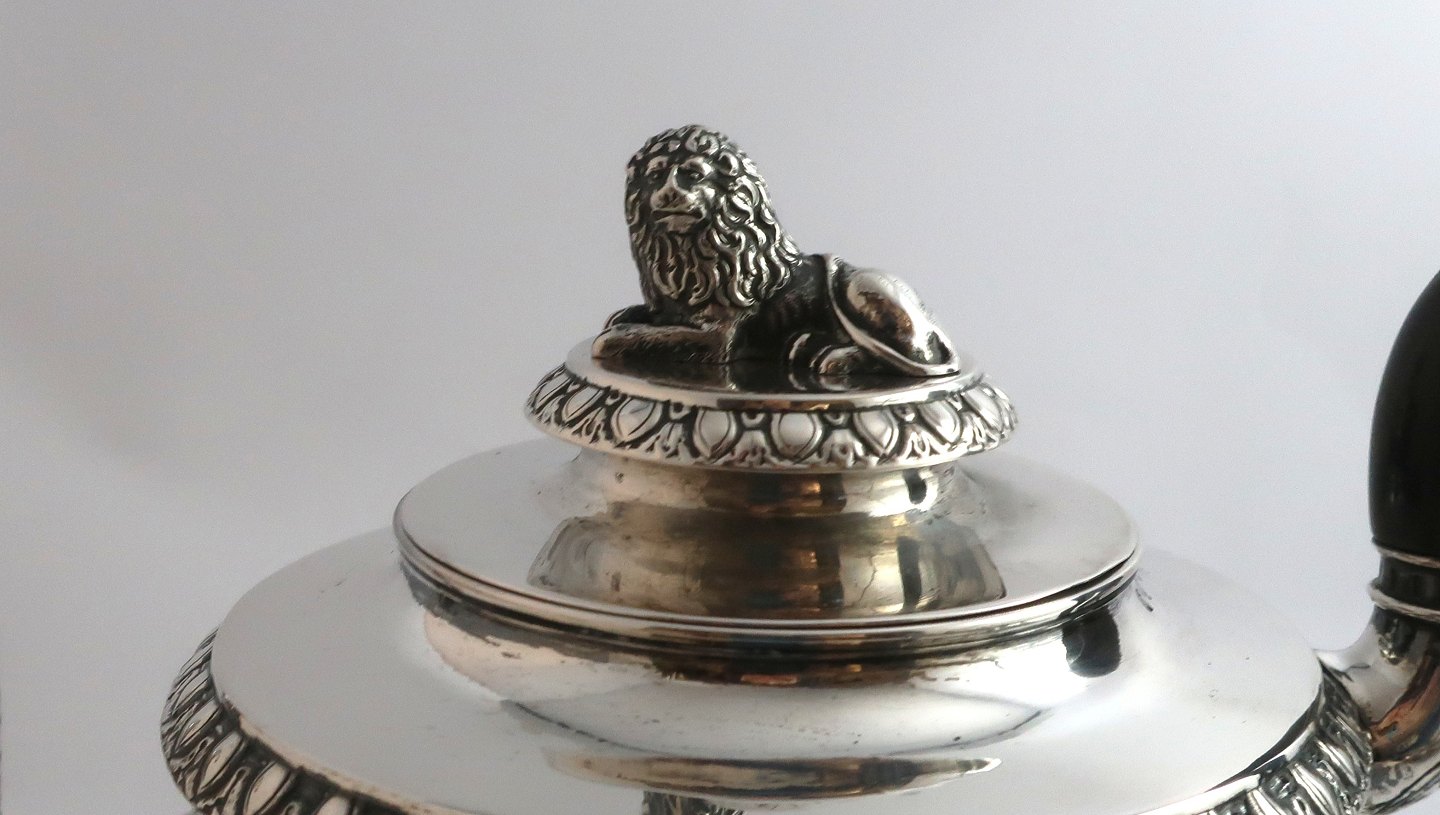 Levin Dyrkopf, Copenhagen (1790-1843). Silver teapot (830). Decorated with a reclining lion on top. Height 21 cm. Produced 1835.
