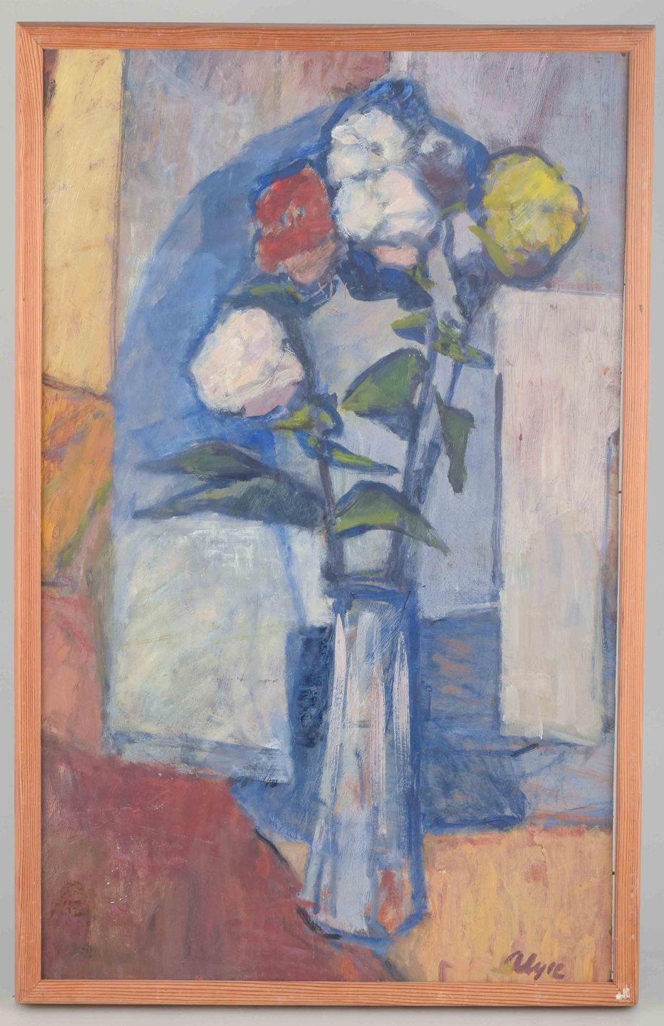 Et modernistisk stilleben med roser i en høj glasvase, udført i et forenklet formsprog med kubistisk inspiration. Farverne holdes i dæmpede blå og rosa toner med kontraster i gult og rødt, hvilket skaber en harmonisk og dekorativ komposition.