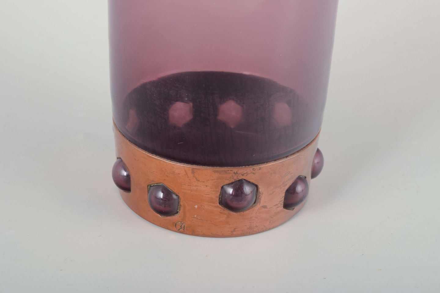 En cylinderformet vase i violet glas monteret i en hamret kobberfod dekoreret med indlagte glasprikker i matchende farve. Designet af Nanny Still for Raak. Kombinationen af farvet glas og metal giver et markant og skulpturelt udtryk, typisk for Stills arbejde med kontraster og materialespil.