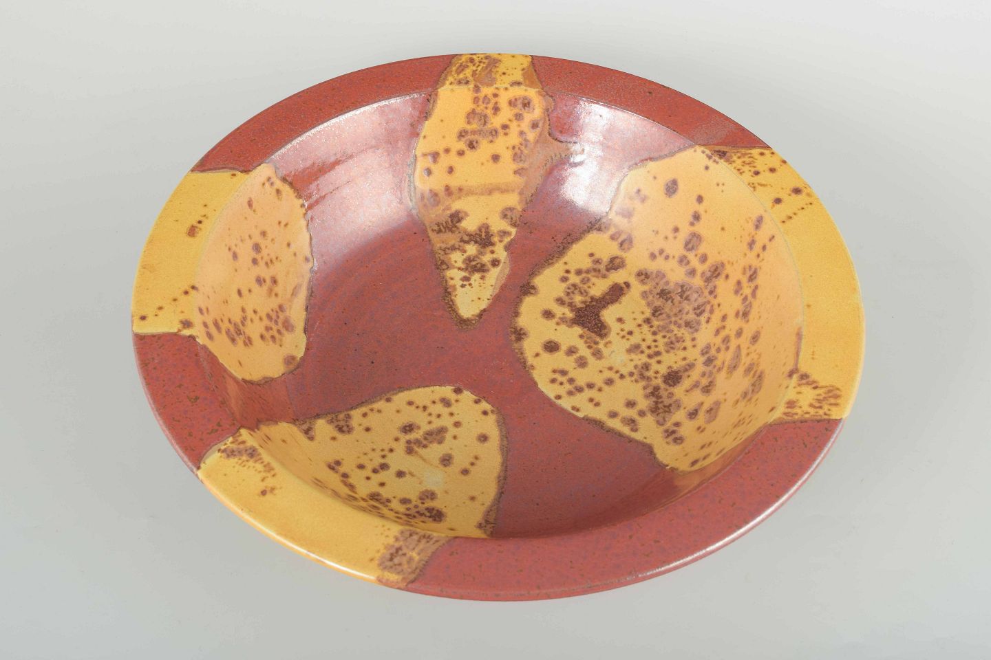 Drejet stentøjsskål med rødbrun bundglasur og dekoration i gule, plettede felter i et organisk, abstrakt mønster.