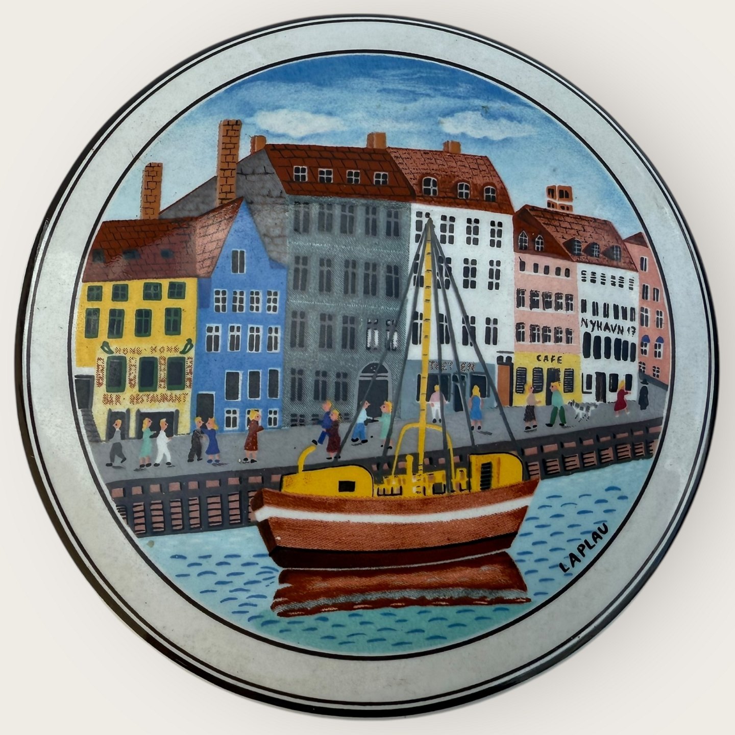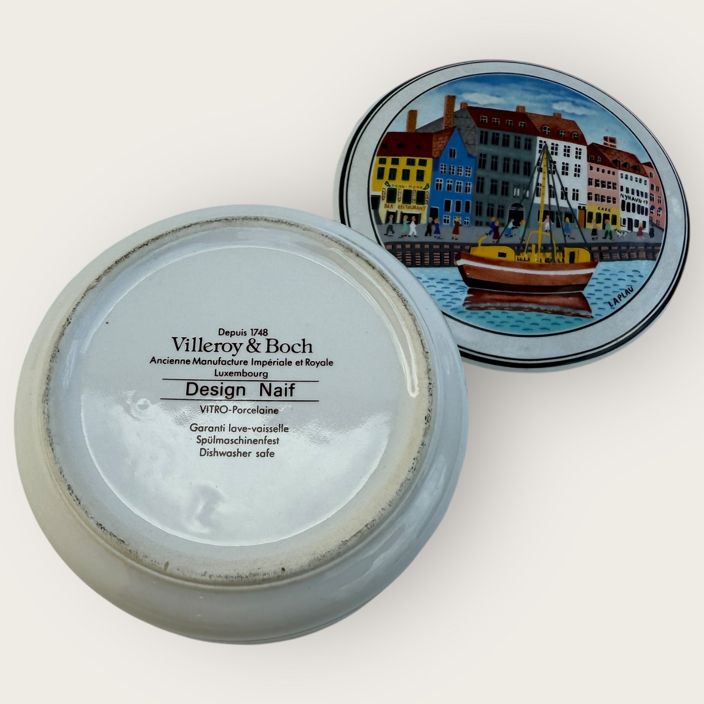 Villeroy & Boch, Design Naif, Laplau motiv fra Nyhavn, lille lågkrukke, diameter 10cm, højde 5cm *pæn stand*