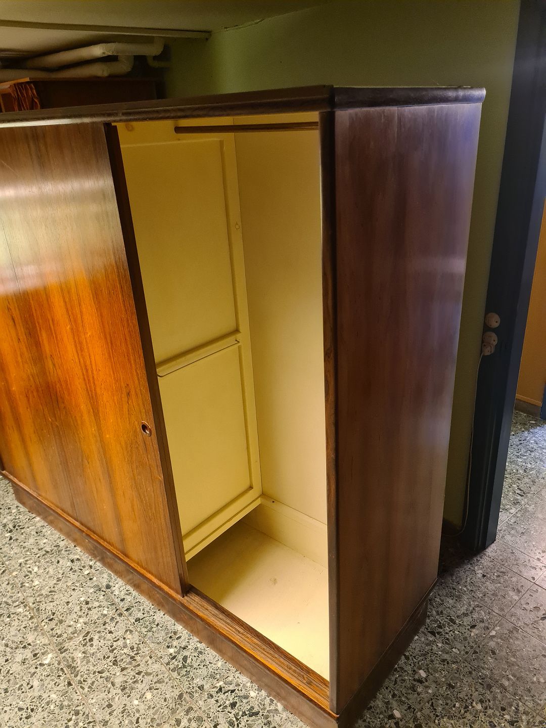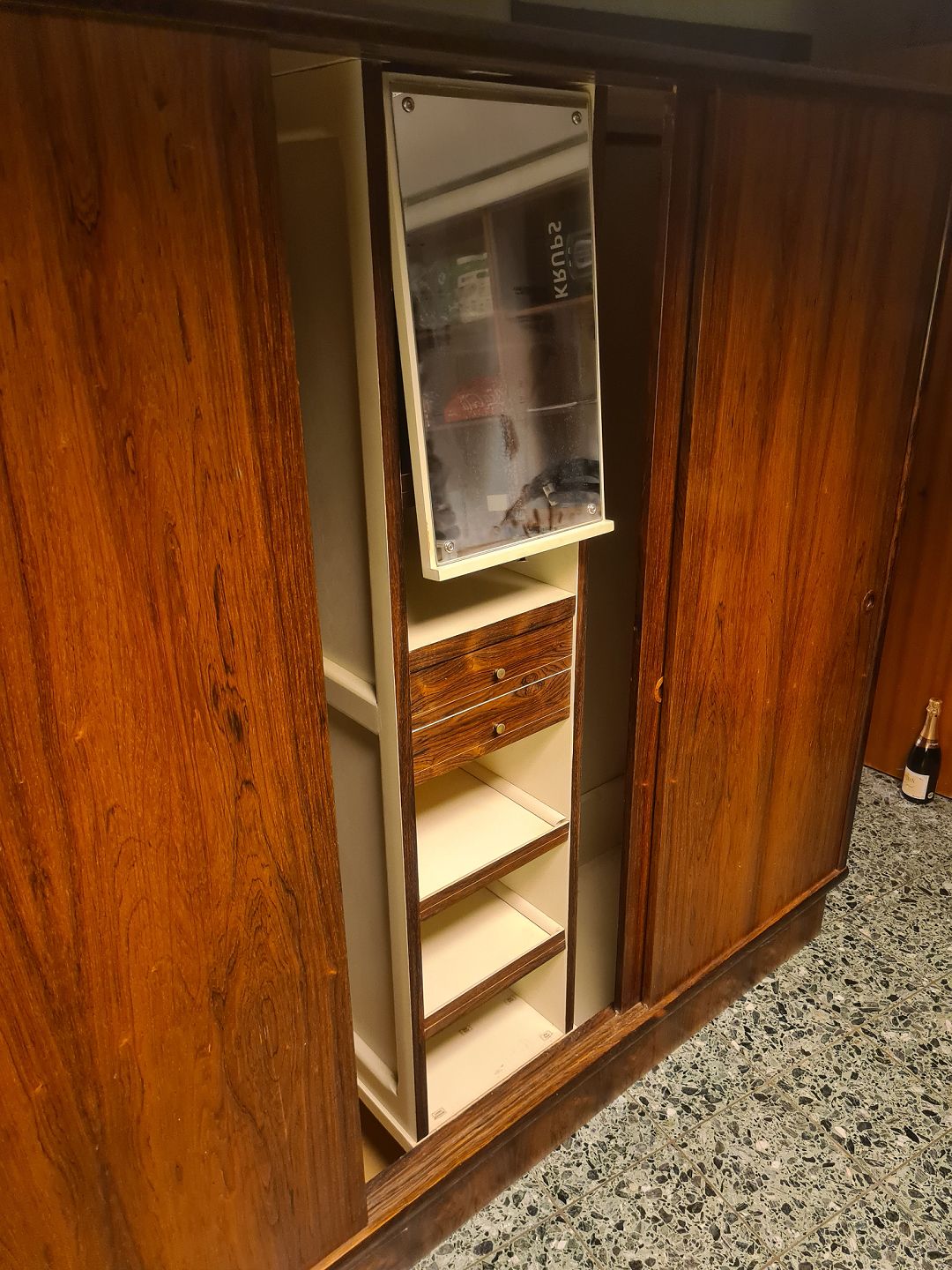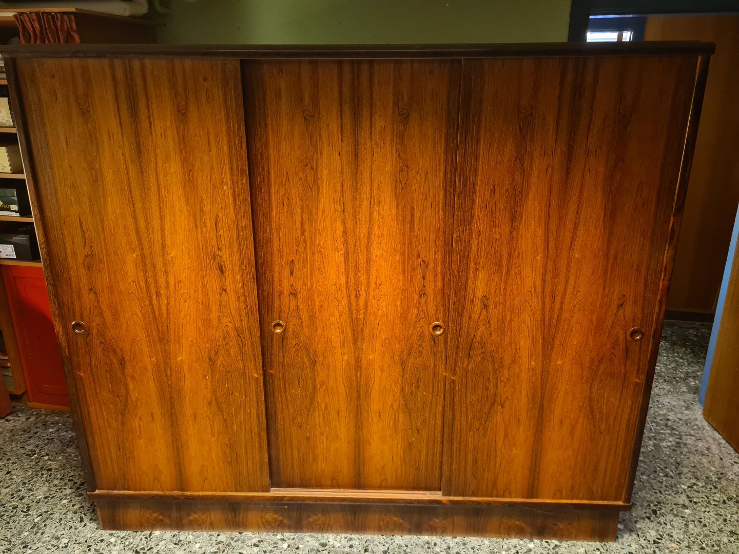 Text available in Danish: 3 dørs skydelåge klædeskab fra 1960'erne i finéret palisander. Fremstår uden overskab, og med uoriginal bund i venstre side (billede) plus et par skruehuller ligeledes i venstre side. (Billede)